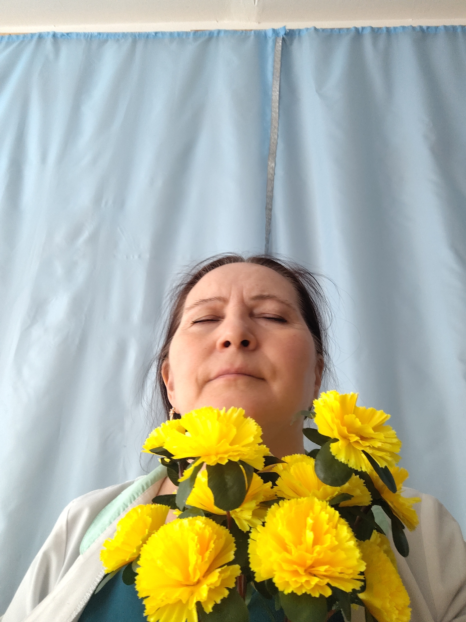 A woman with her eyes closed is standing indoors, holding a bouquet of yellow flowers in front of her chest. She has dark hair pulled back from her face and is wearing a white jacket over a blue shirt…read more