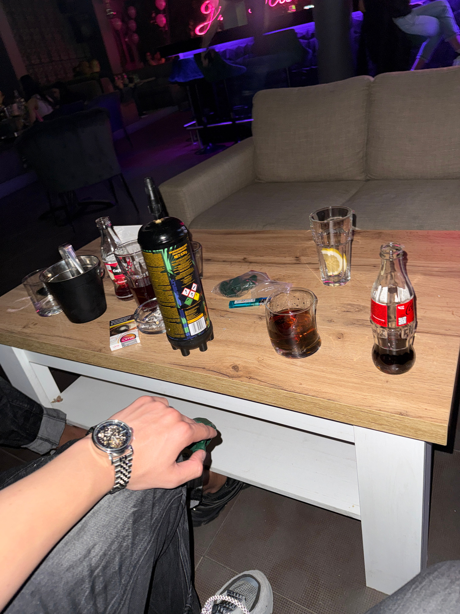The image shows a scene on a table, likely in a bar or nightclub setting. The table is covered with various objects, including empty liquor bottles (Coca-Cola, Jagermeister), glasses, and a gas canist…read more