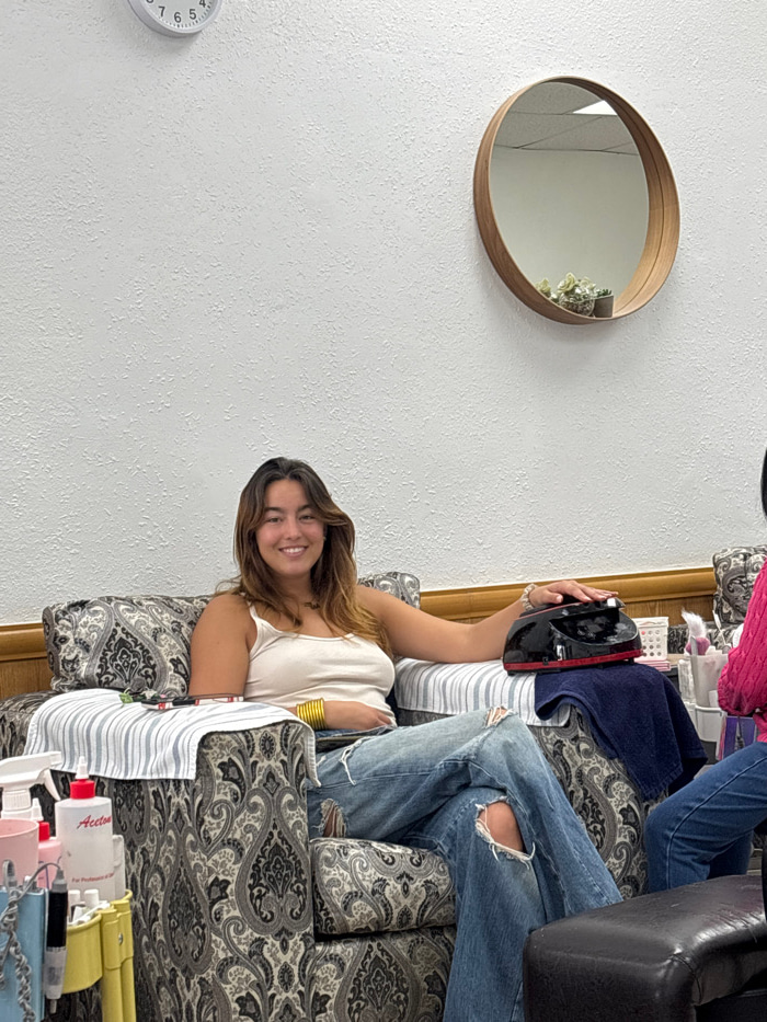 A woman smiles while sitting on an ornate patterned sofa, holding a black and red object, possibly beauty related. She wears a white top, ripped blue jeans, and multiple gold bracelets. Behind her, an…read more