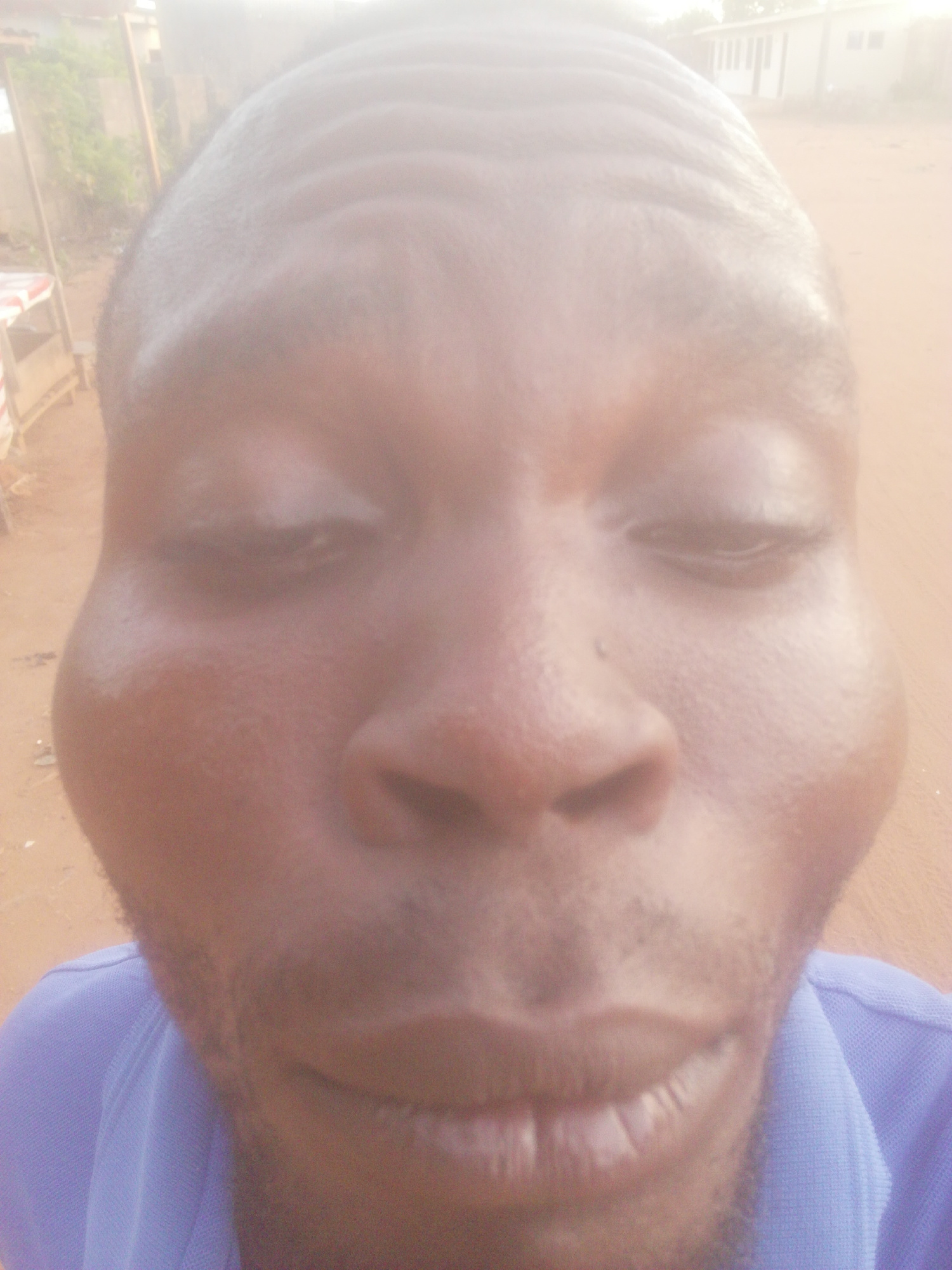 The image depicts a close-up, head-and-shoulders view of a dark-skinned individual, likely male, with eyes closed. The individual's cheeks appear swollen. The background shows an indistinct outdoor se…read more