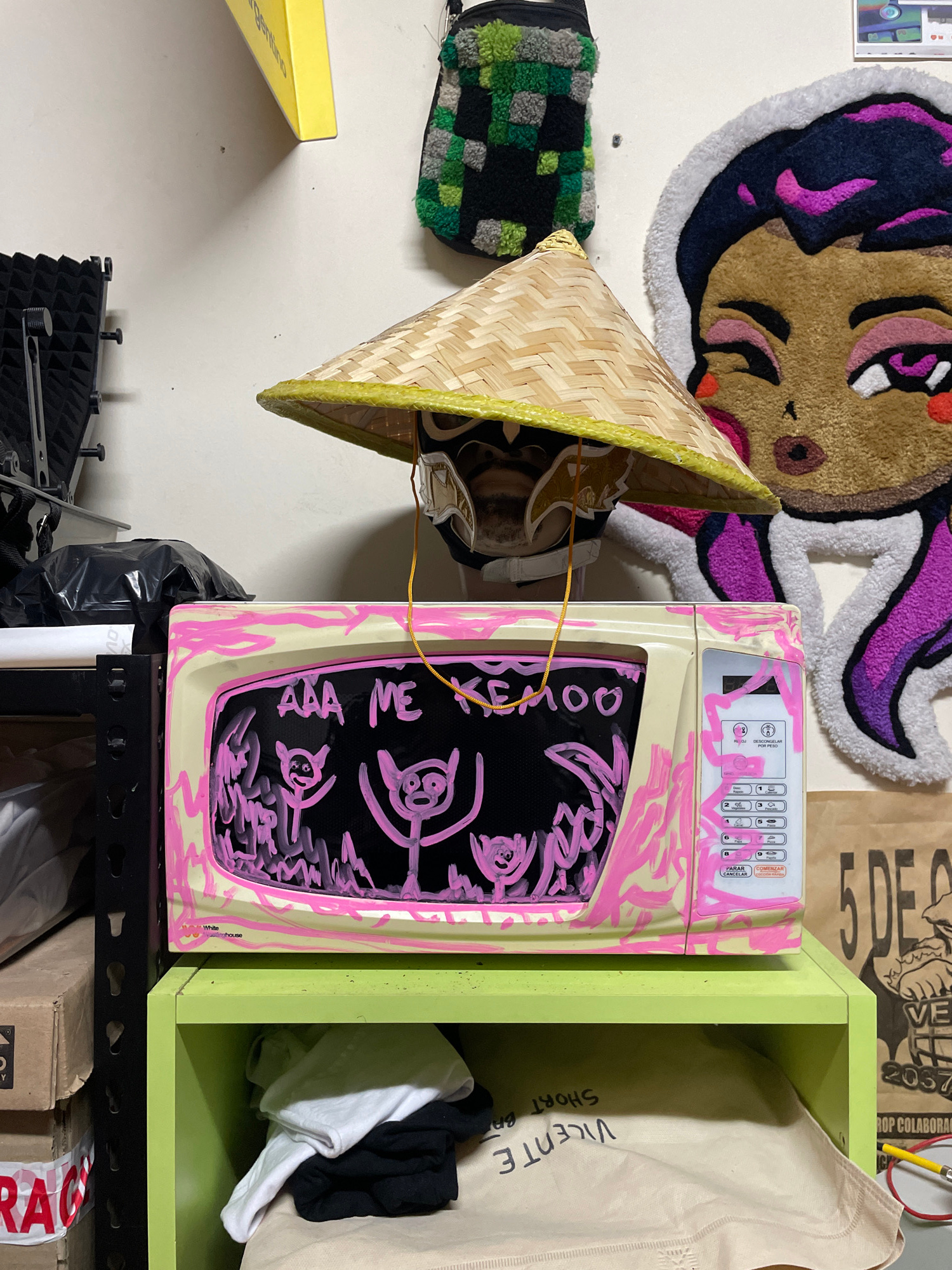 The image presents an assortment of objects and textures against a white wall. On the upper left, there's a round rug depicting a face, followed by a Vietnamese conical hat hanging next to a green andβ¦read more