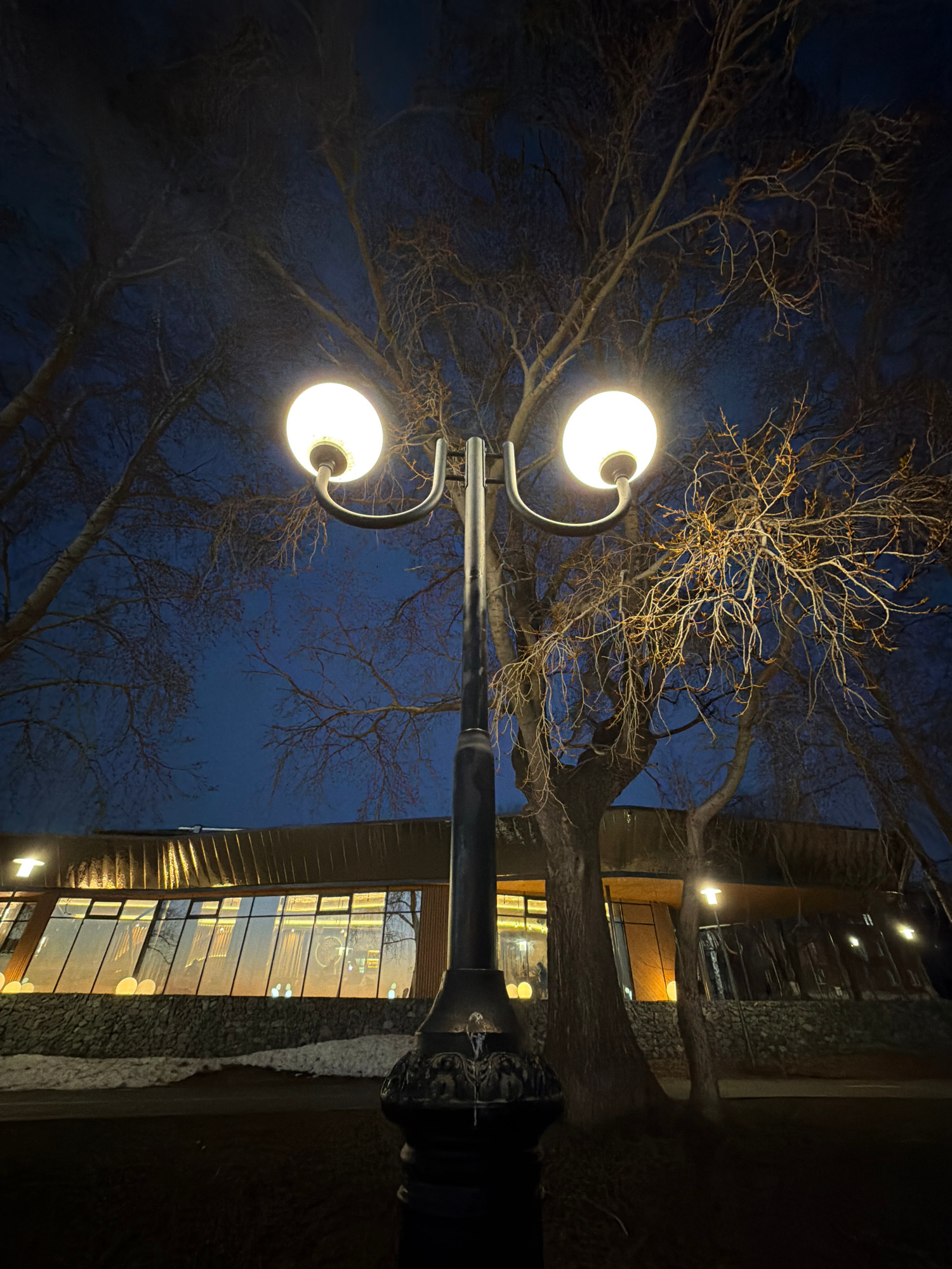 At night in Votkinsk, Russia, a low-angle shot focuses on a lamppost with two spherical lights. Bare tree branches surround the lights and spread across the dark blue sky. A building with large windowβ¦read more