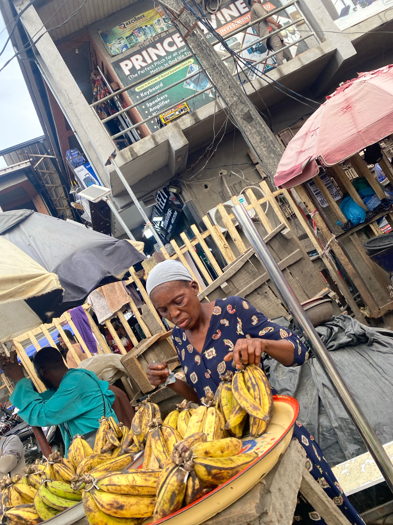 An eye-level, tilted shot depicts an outdoor marketplace in Lagos, Nigeria. An African woman wearing a dark blue, patterned top and a white head covering is seen examining a bunch of plantains. The pl…read more