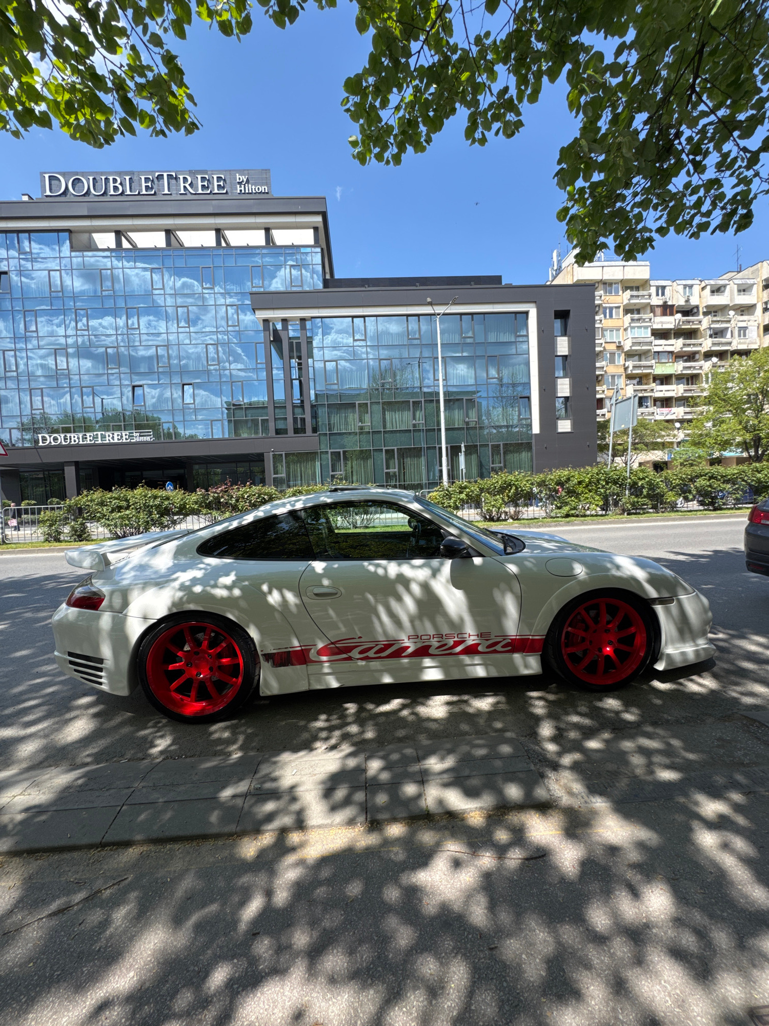 The image depicts a white Porsche Carrera parked on the street in Plovdiv, Bulgaria. The car features a red "Carrera" stripe along its side and red wheels. In the background is the DoubleTree by Hilto…read more