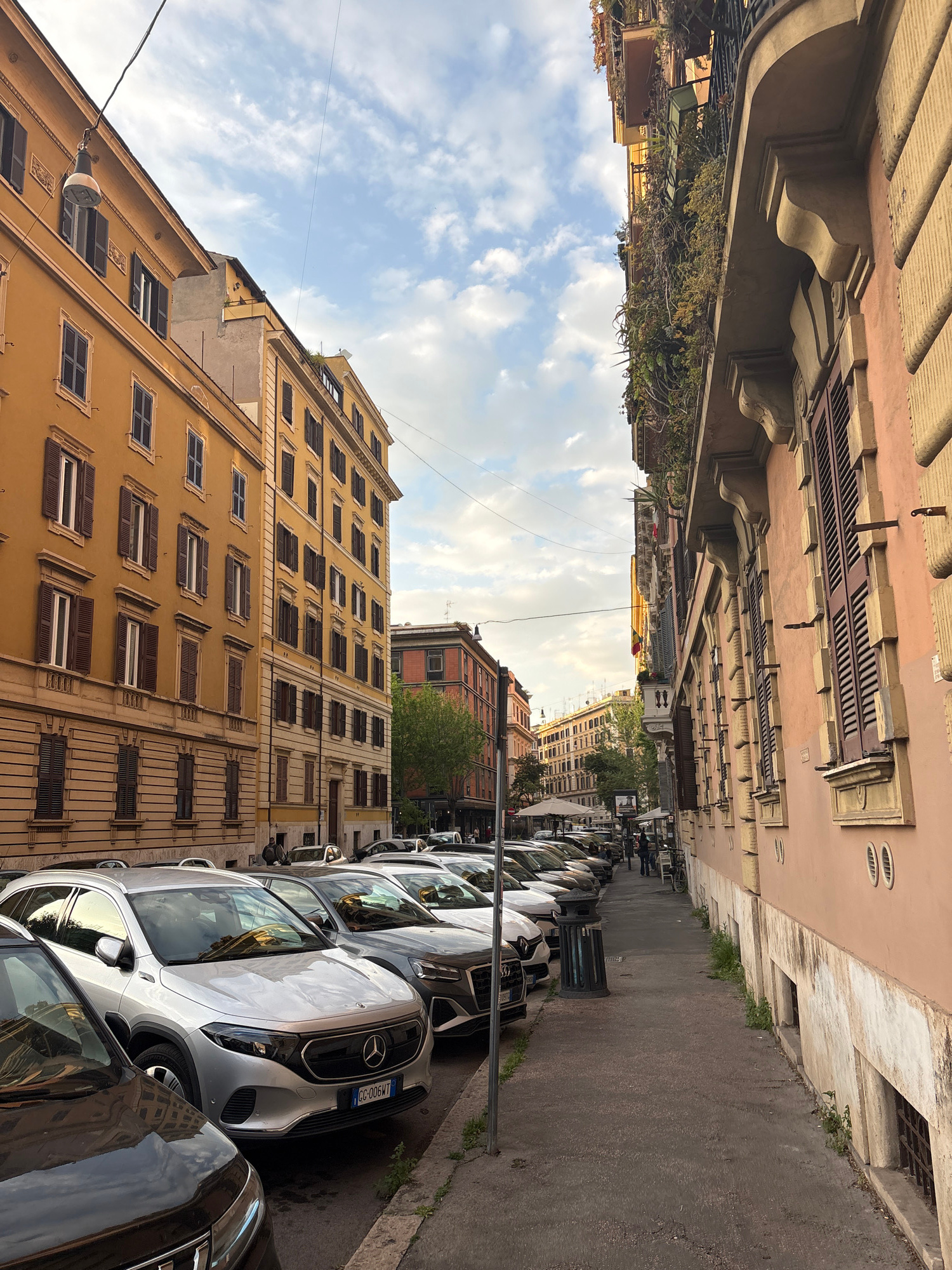 This image portrays a street scene in Rome, Italy. The photo is taken from a low angle, looking down a narrow street lined with parked cars on the right side. The buildings on either side of the streeβ¦read more