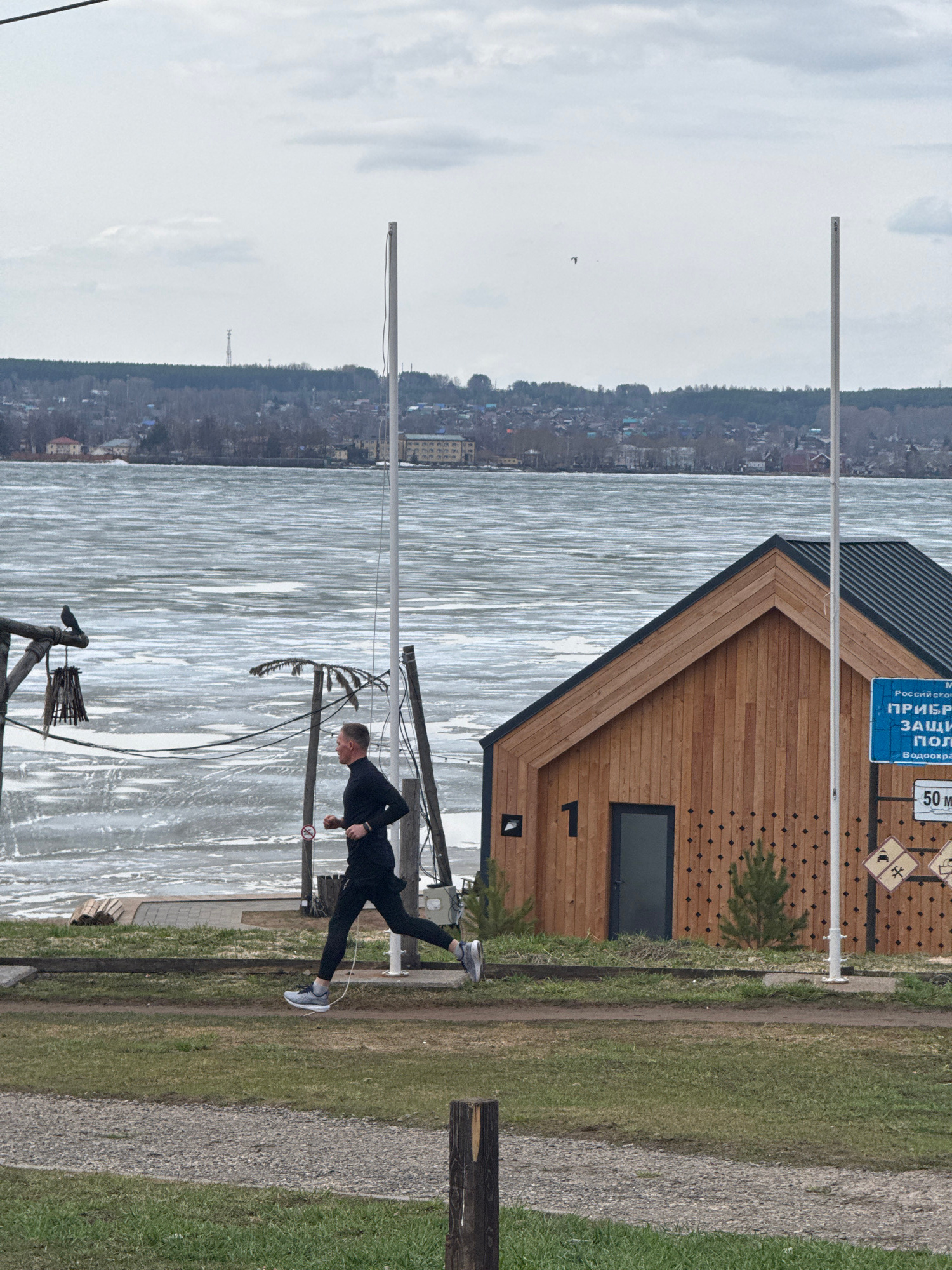 A man in dark athletic clothes is balancing on one leg on a platform next to a body of water in Votkinsk, Russia. A wooden building is adjacent to him. A town is visible across the water. The sky is o…read more