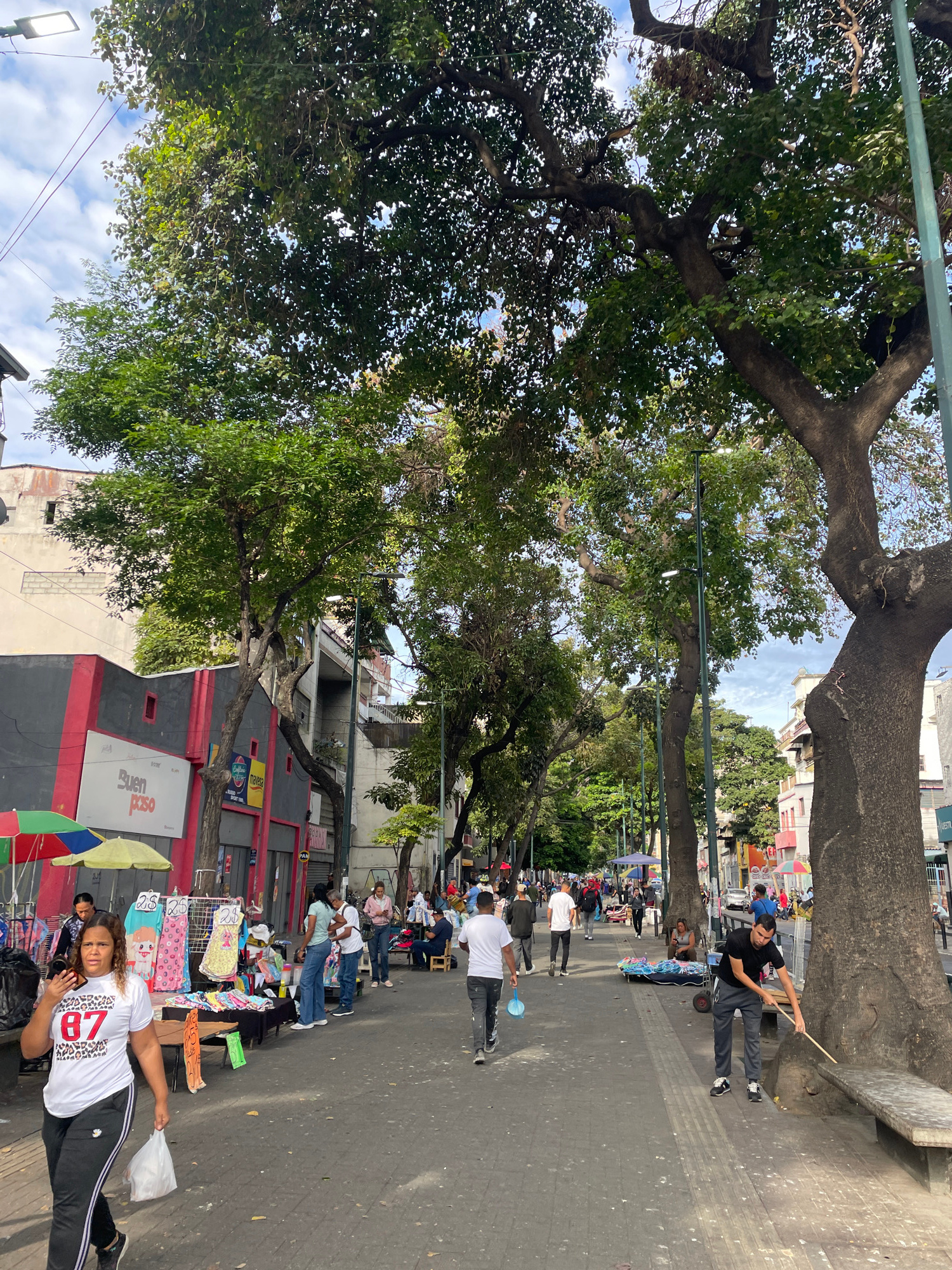 The image captures a bustling street scene in Caracas, Venezuela. A wide pedestrian walkway, likely a marketplace, is lined with mature, leafy trees providing shade. People are engaged in various acti…read more