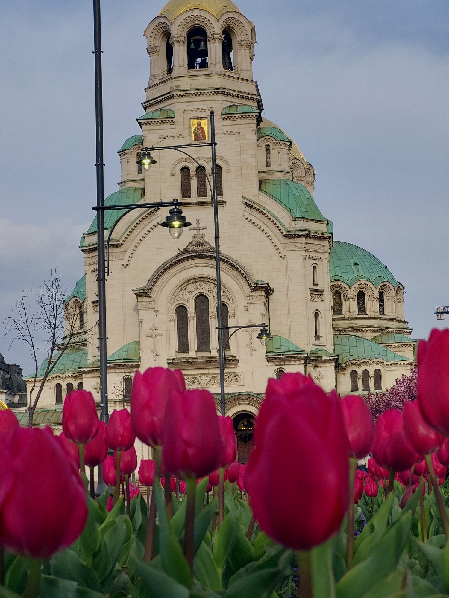 The image, presented in a portrait orientation, showcases the majestic Alexander Nevsky Cathedral in Sofia, Bulgaria, partially obscured and framed by a vibrant bed of pink tulips in the foreground. T…read more