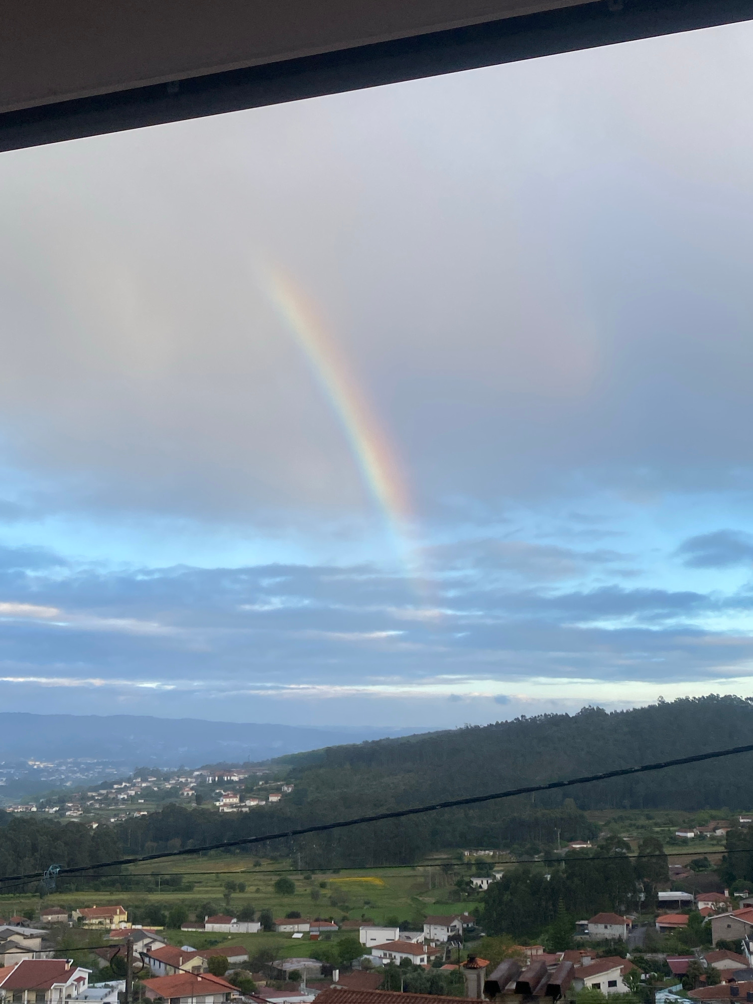 The image depicts a landscape from an elevated vantage point, possibly a balcony or high window. A faint rainbow is visible in the sky, stretching across the left portion of the frame. The foreground…read more