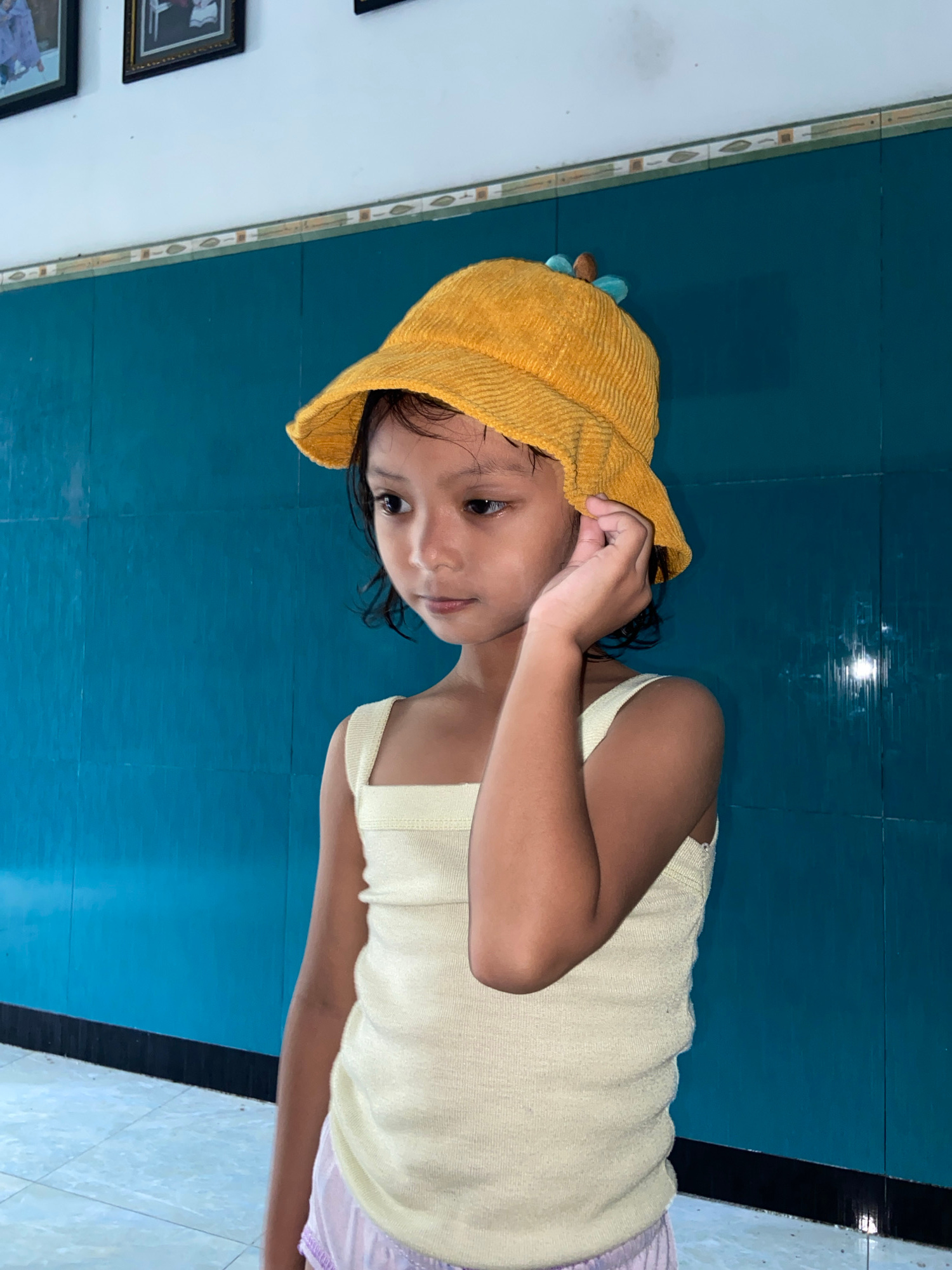 A young girl wearing a yellow corduroy hat and a light yellow tank top is standing against a blue tiled wall. She is touching her ear. The background shows a combination of blue tiled walls, white wal…read more