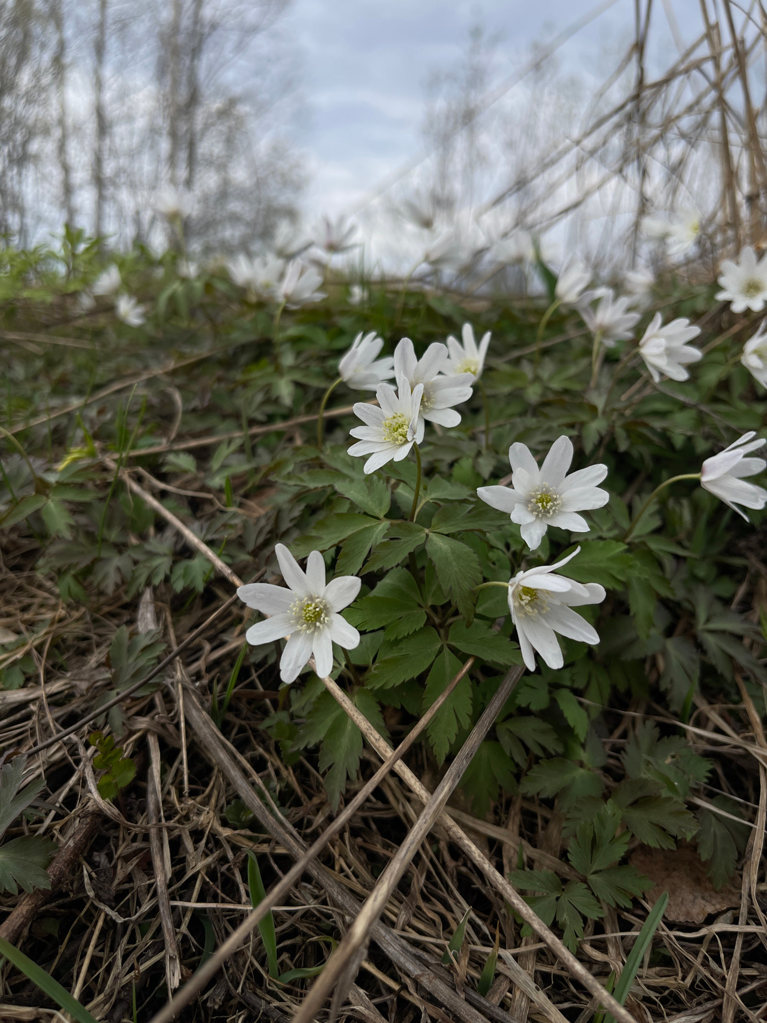 The image depicts a close-up view of several white flowers with green foliage growing on the ground. Dry grass and debris surround the plants. The background shows a blurred scene of trees and a cloud…read more