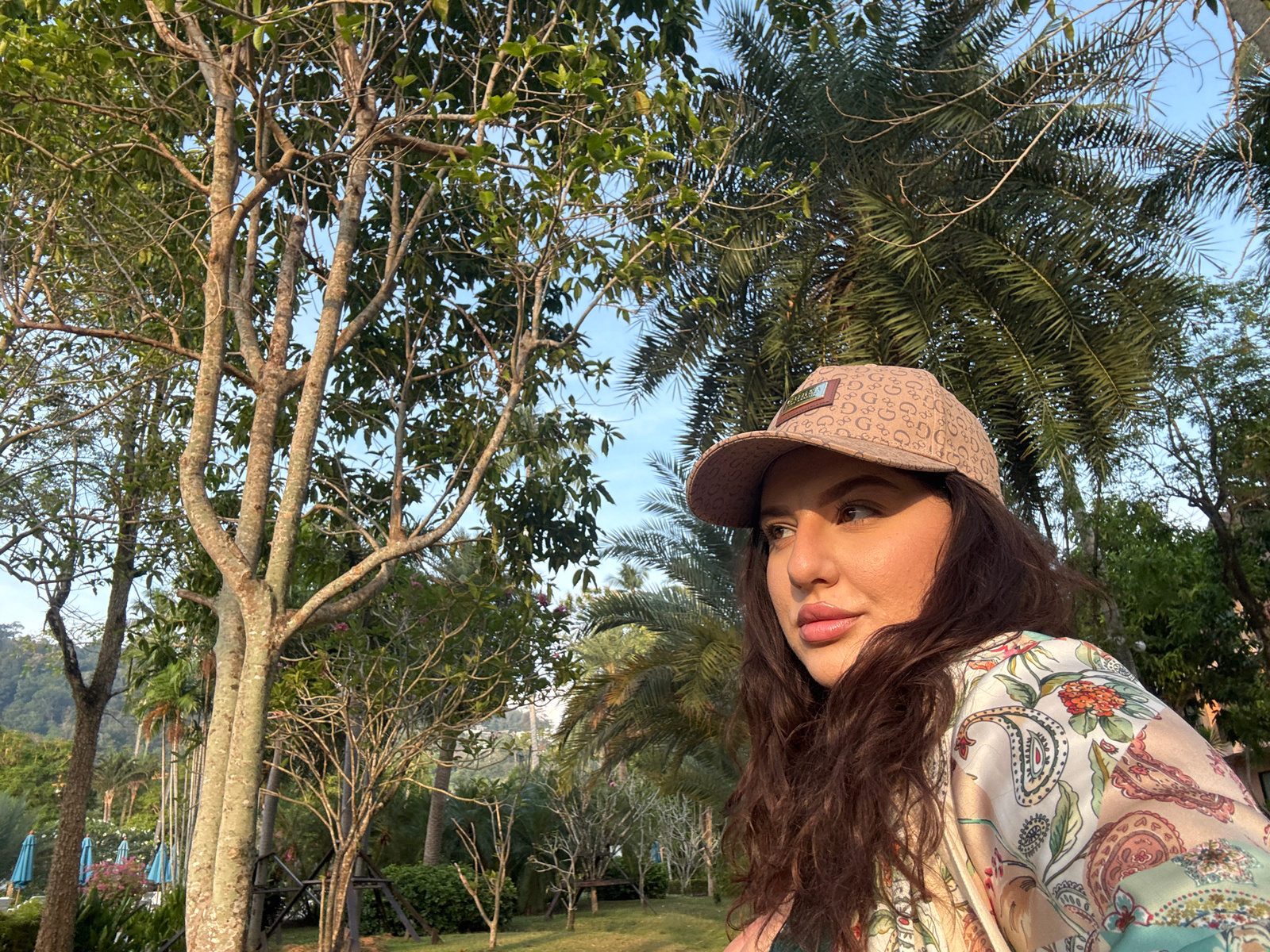 The image shows a woman with long, dark wavy hair wearing a patterned cap and a patterned shirt in an outdoor setting. She is looking to the side, away from the camera. The background includes various…read more