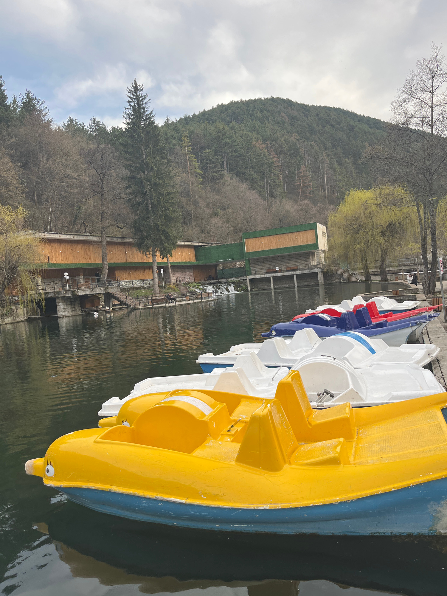 The image shows a row of pedal boats docked on a lake in Velingrad, Bulgaria. The boats are yellow, white, and red/blue. In the background is a forested hill under a cloudy sky, and a wooden structure…read more