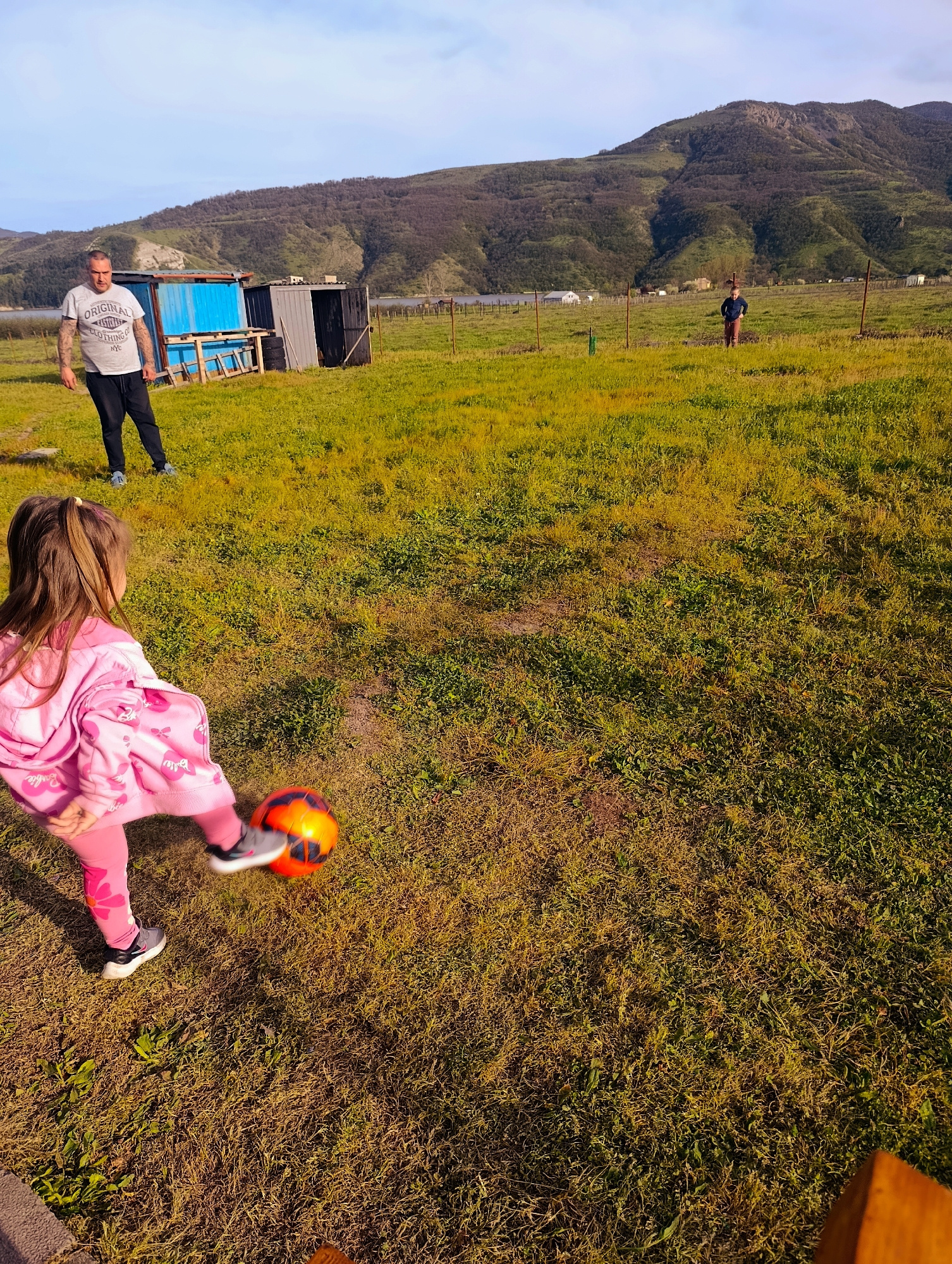 The image shows a young girl in pink sportswear kicking an orange and black soccer ball on a grassy field in what appears to be the city of Shiroko Pole, Bulgaria. A man wearing a grey t-shirt and dar…read more