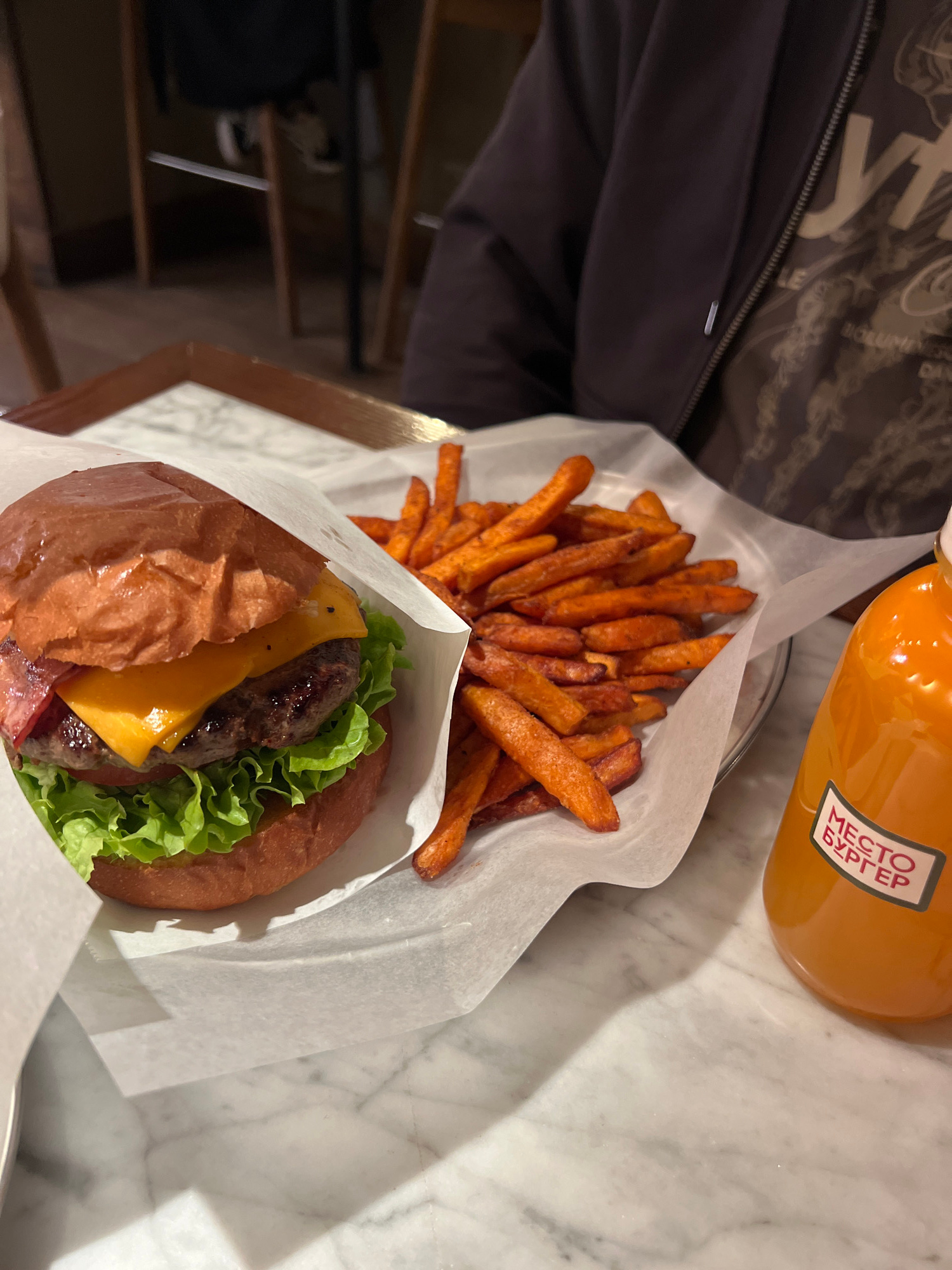 An overhead, close-up shot captures a casual meal set on a white marble-patterned table. The main subjects are a burger, a serving of fries, and a bottled drink. On the right, a burger is partially u…read more