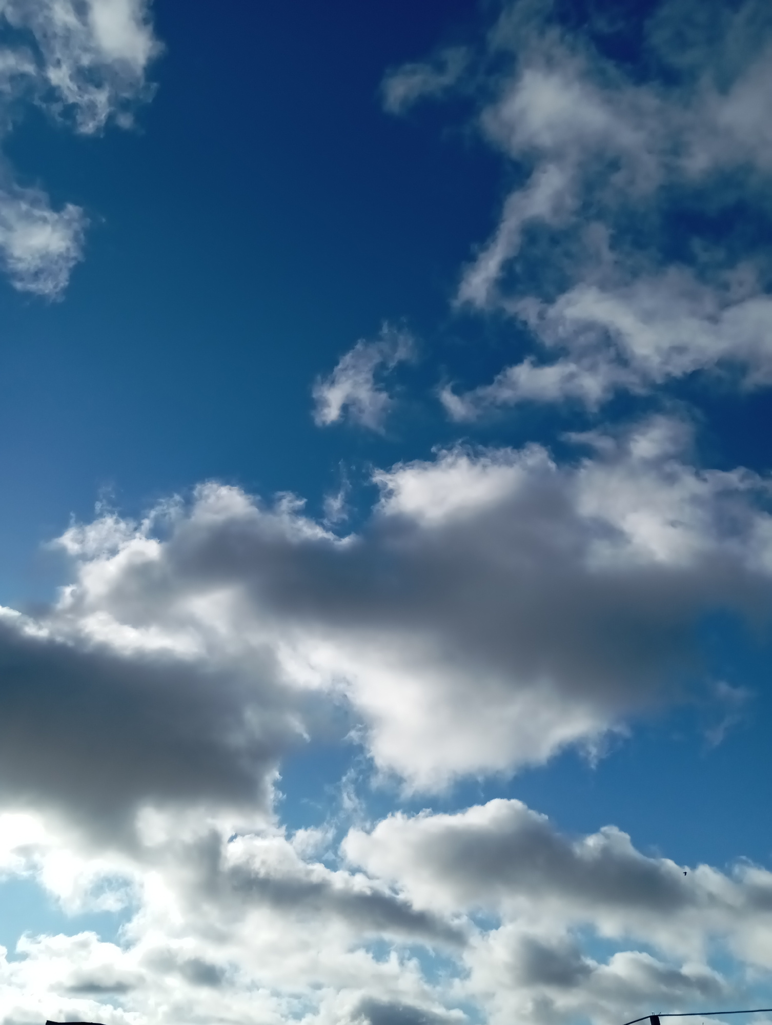 The image shows a daytime sky with blue patches and scattered cumulus clouds. The clouds range in color from bright white to dark gray, suggesting varying density and sunlight penetration. The image d…read more