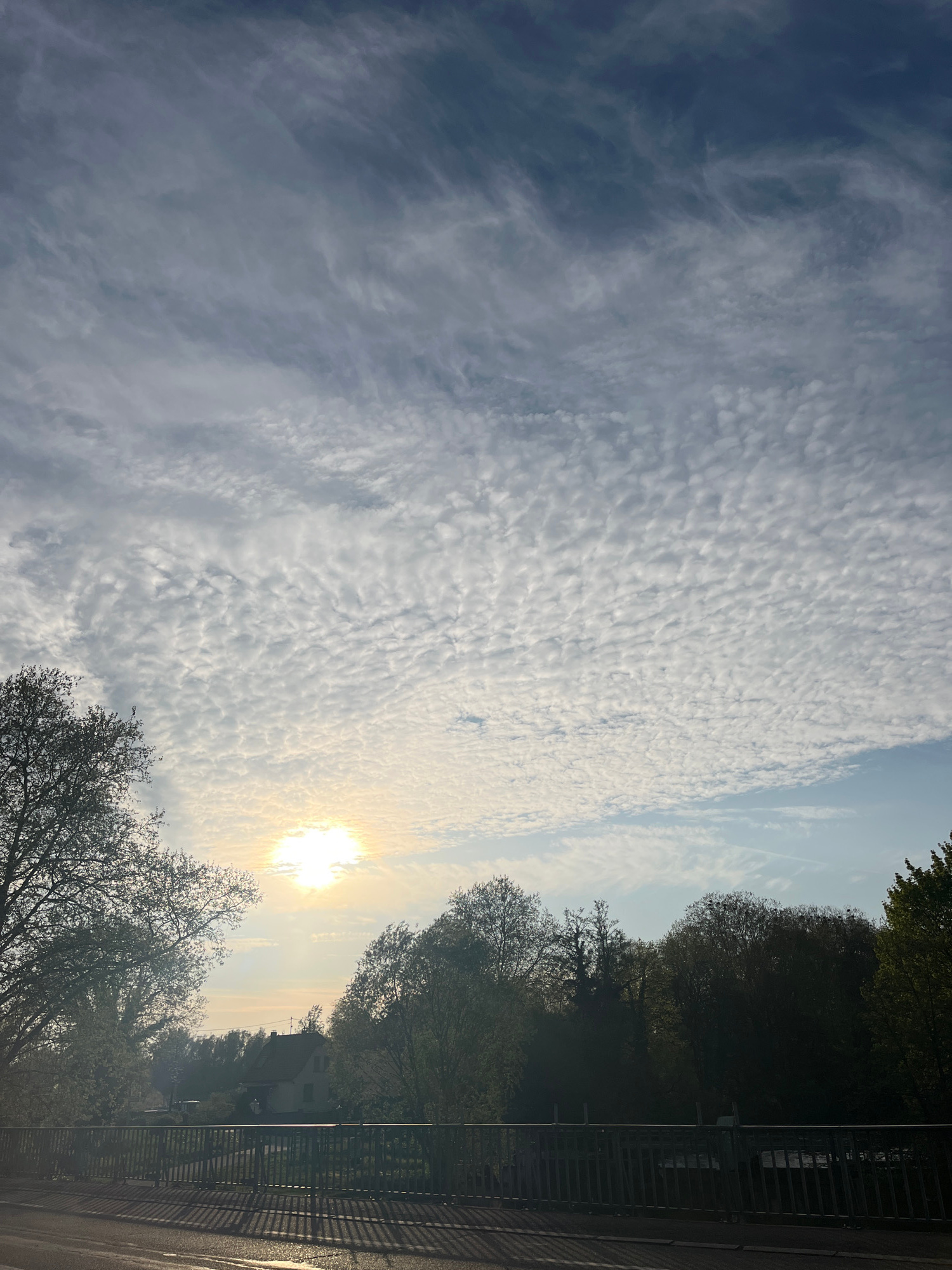 The image is taken in Geispolsheim-Gare, France. It shows a view of the sky with a patterned cloud formation resembling altocumulus clouds filling the upper portion of the frame. The sun is visible, c…read more