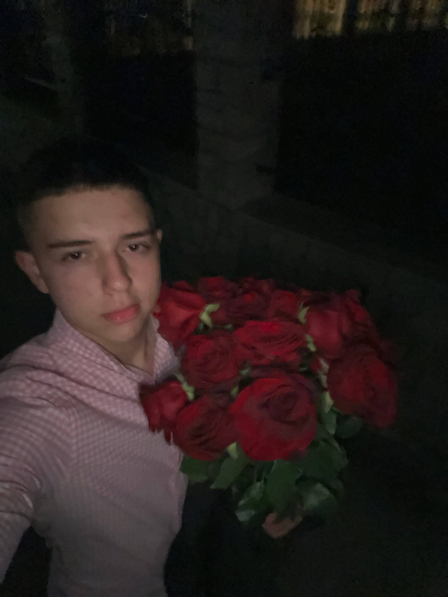A young male individual is lying down, with a bouquet of red roses placed on his chest. The image is taken in low lighting conditions. The background is dark and obscured, but it appears to be outdoor…read more