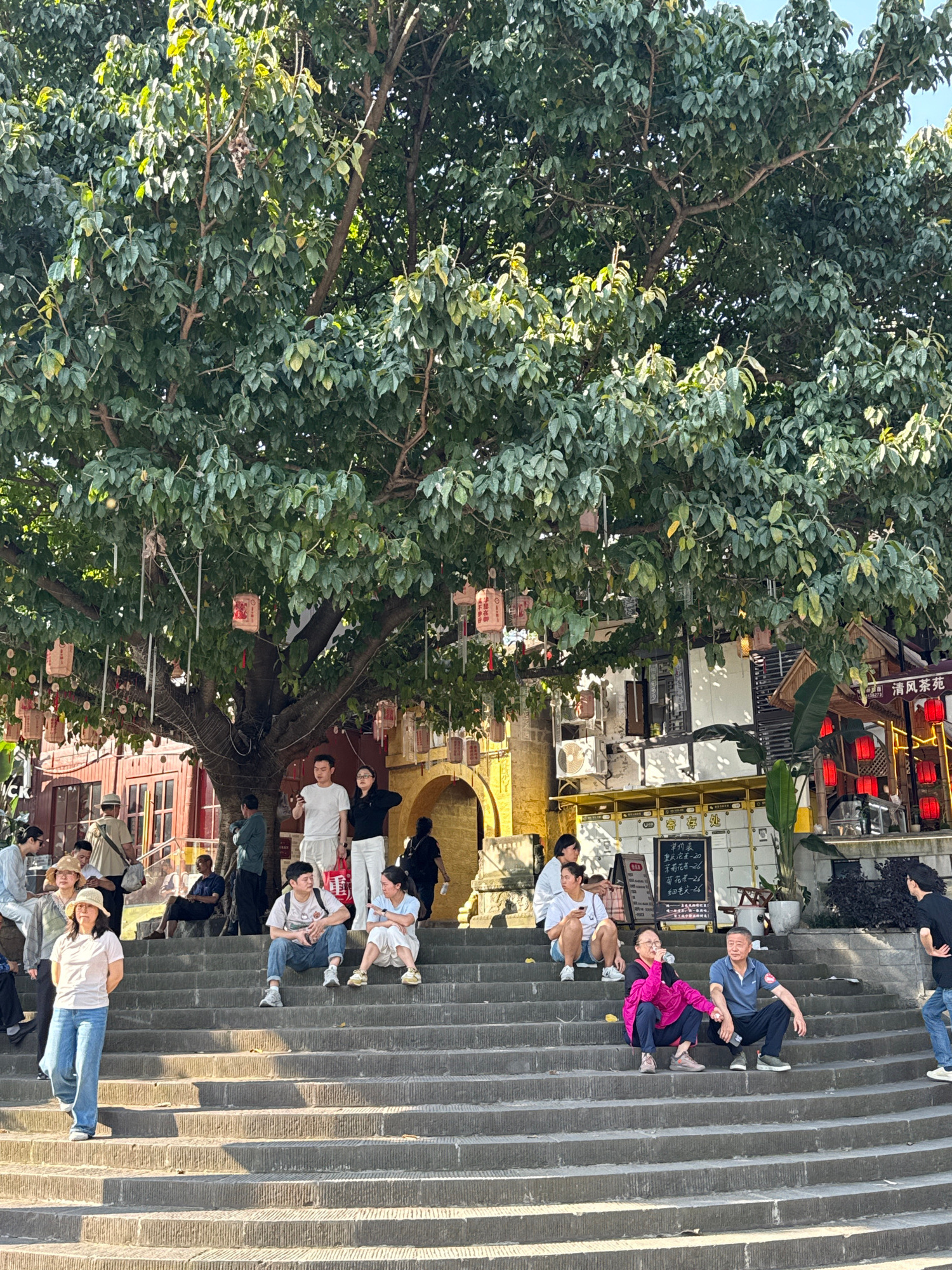 The image depicts a scene in Shapingba District, China. A large tree with dense green foliage dominates the left side of the image. People are sitting on concrete steps that extend diagonally from the…read more