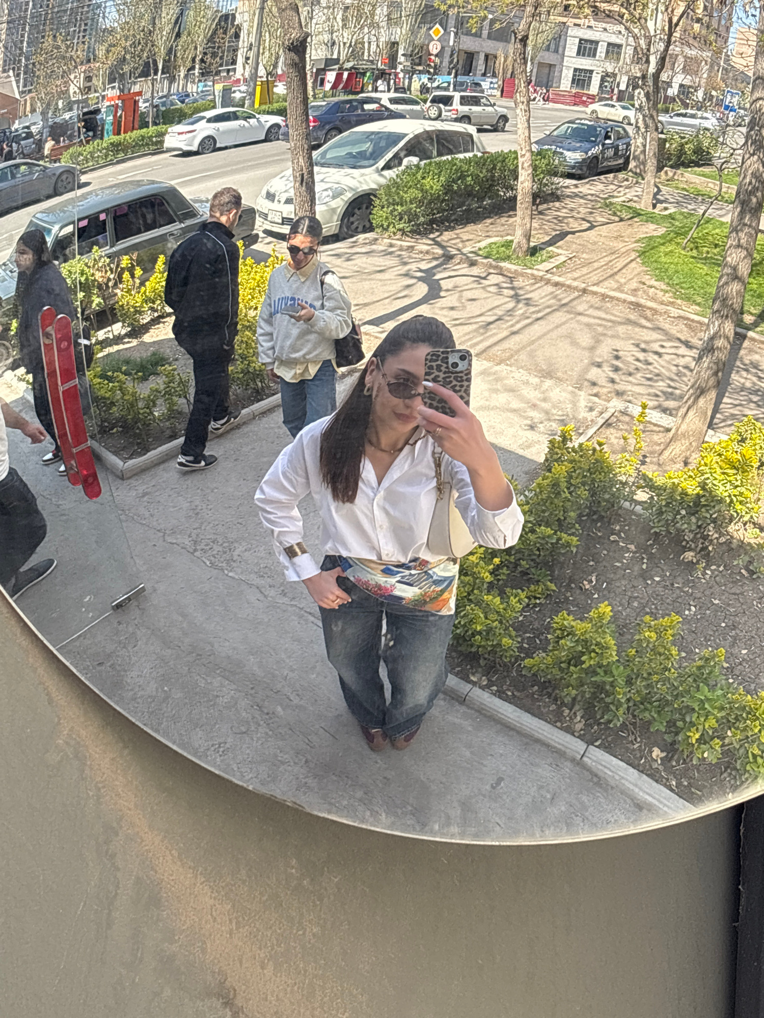 The image, rotated approximately 90 degrees counter-clockwise, presents a reflection in a large, circular convex mirror, capturing an urban street scene in Yerevan, Armenia, on a sunny day. In the fo…read more