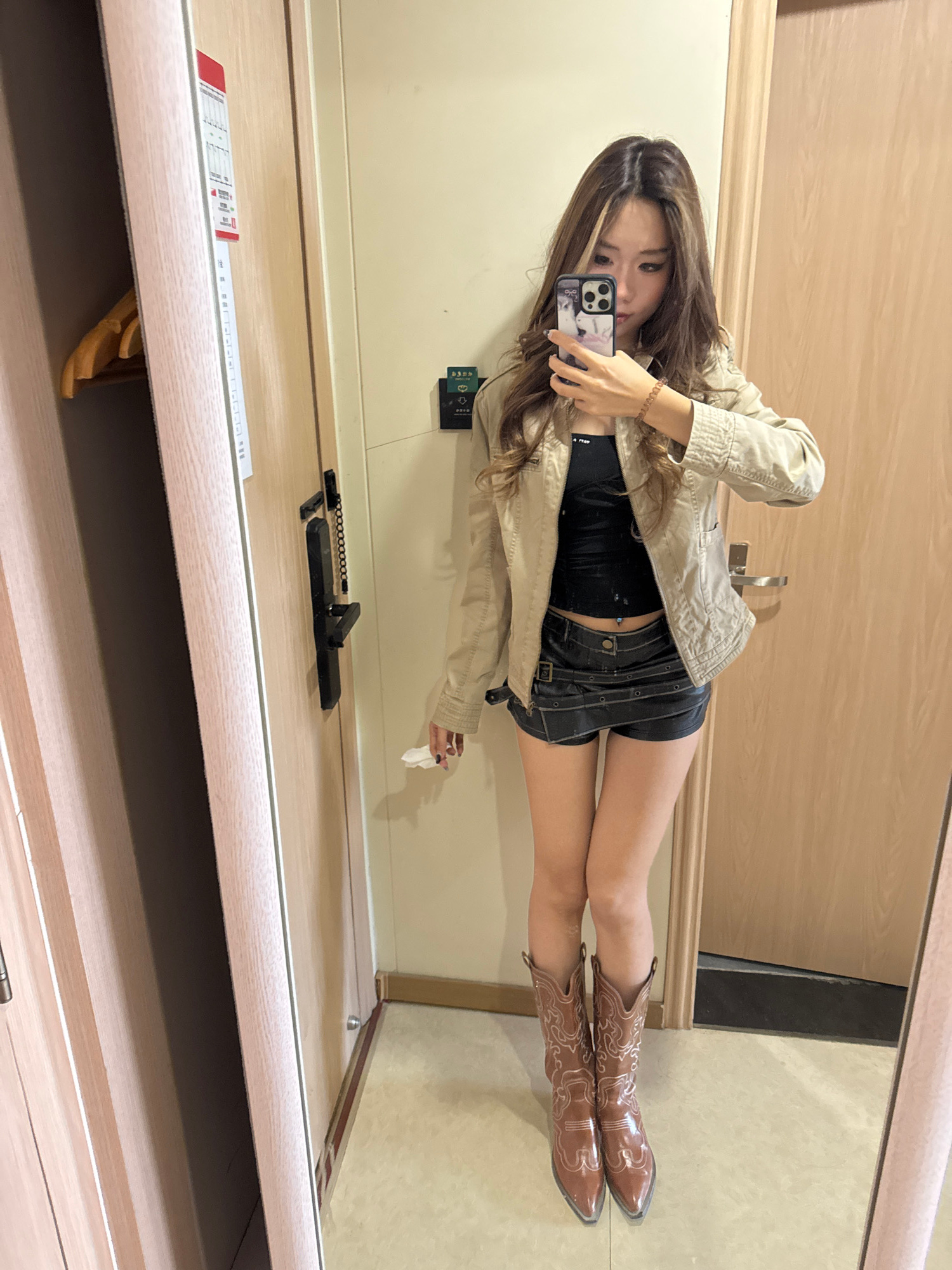 A young woman is taking a mirror selfie. She is wearing a light brown jacket, a black top, a dark jean skirt, and brown cowboy boots. She is holding a smartphone in her left hand. The mirror is positiβ¦read more