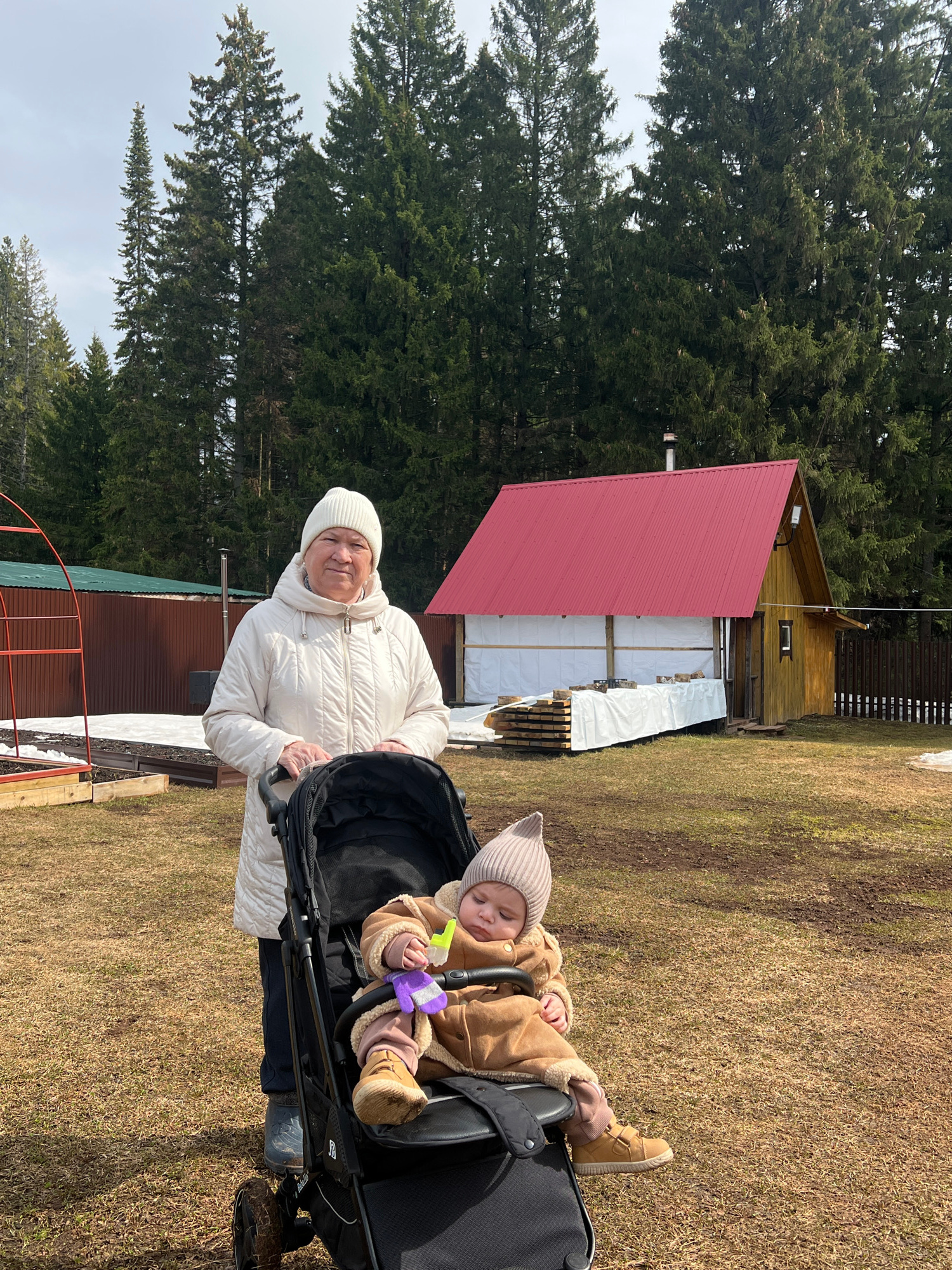 A woman is standing outside, pushing a baby in a stroller. The baby is asleep, holding a toy. Behind the woman and the stroller is a lawn with grass and trees, as well as a cabin with a red roof. The…read more