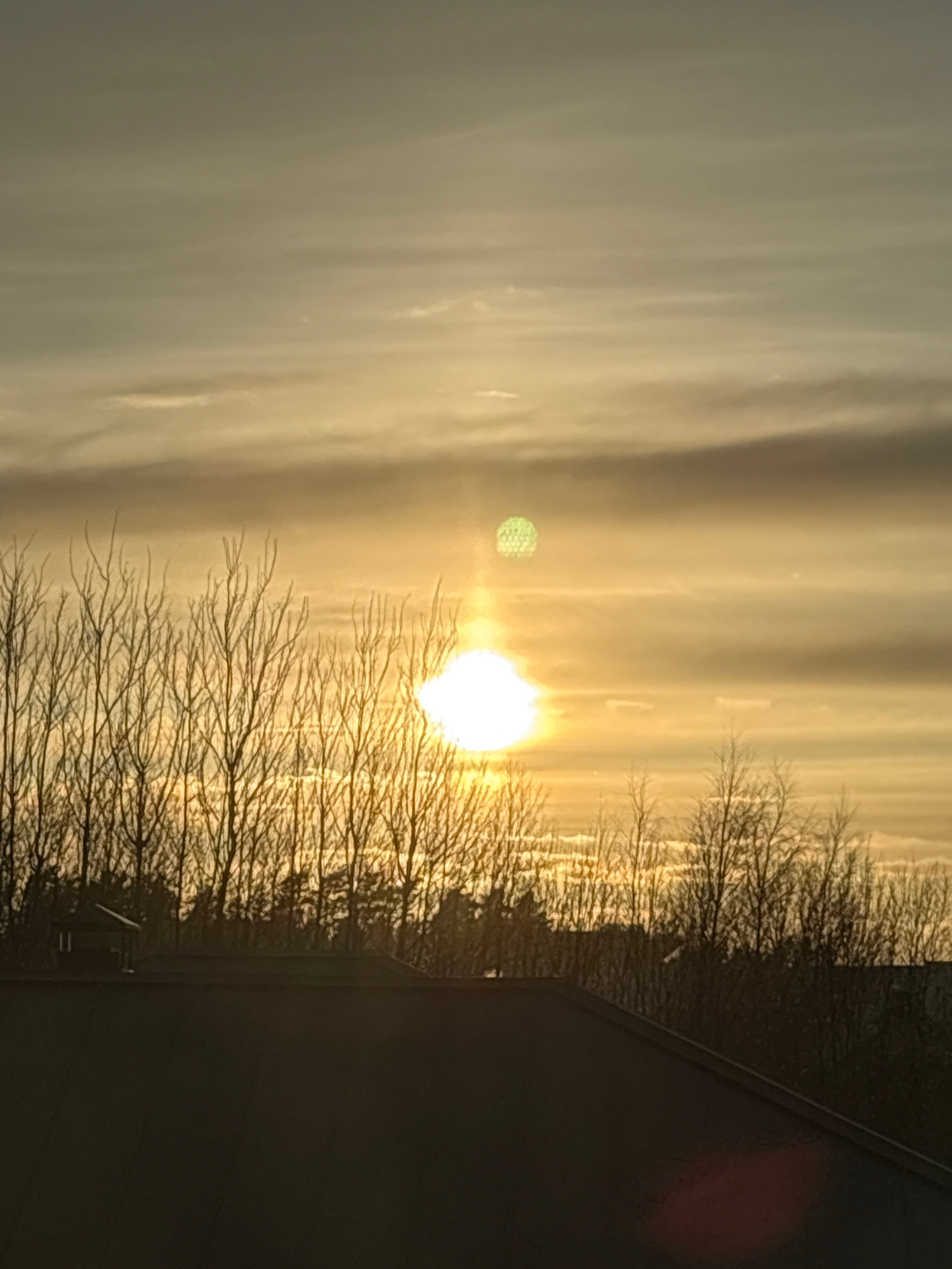The image depicts an outdoor scene during sunrise or sunset in Dreiliņi, Latvia. The dominant feature is a bright, white solar orb situated on the horizon, obscured partially by a dense line of silhou…read more