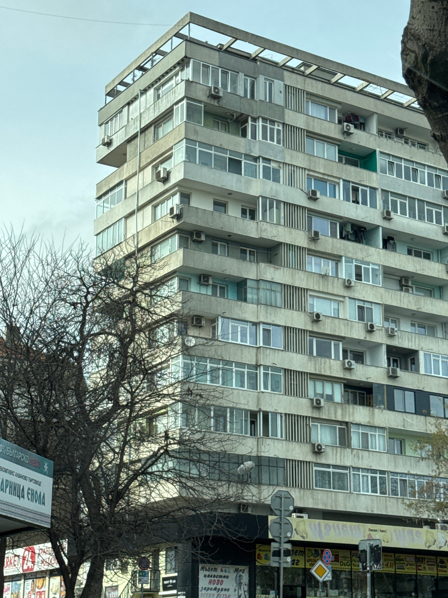 The image shows a tall, grey, concrete apartment building in Varna, Bulgaria, likely constructed in the mid-to-late 20th century. The building has a repetitive facade of stacked rectangular windows an…read more