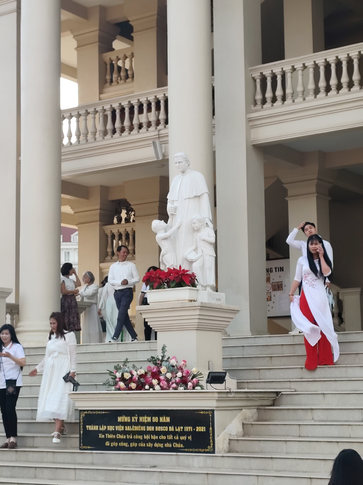 The image shows the exterior of a building, likely a religious institution, with multiple columns and balustrades. A statue of a robed figure with two children stands prominently on a pedestal, adorne…read more