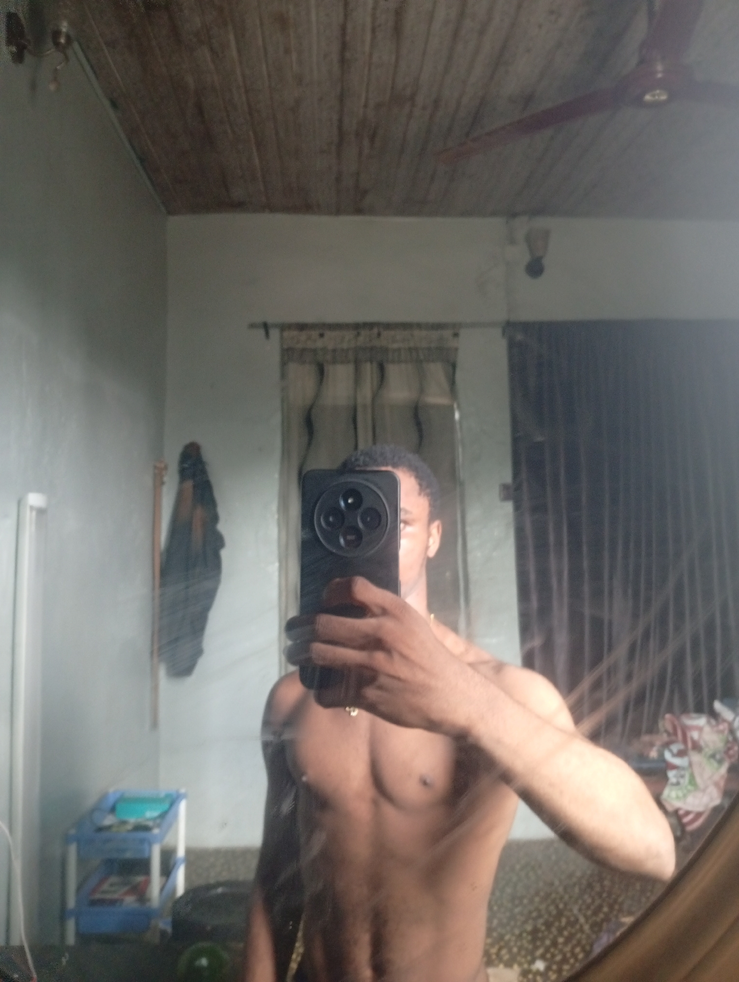 This mirror selfie, taken in Owerri, Nigeria, features a shirtless person, likely male, whose upper torso and arms are visible. They are holding a black smartphone with a prominent multi-lens camera m…read more