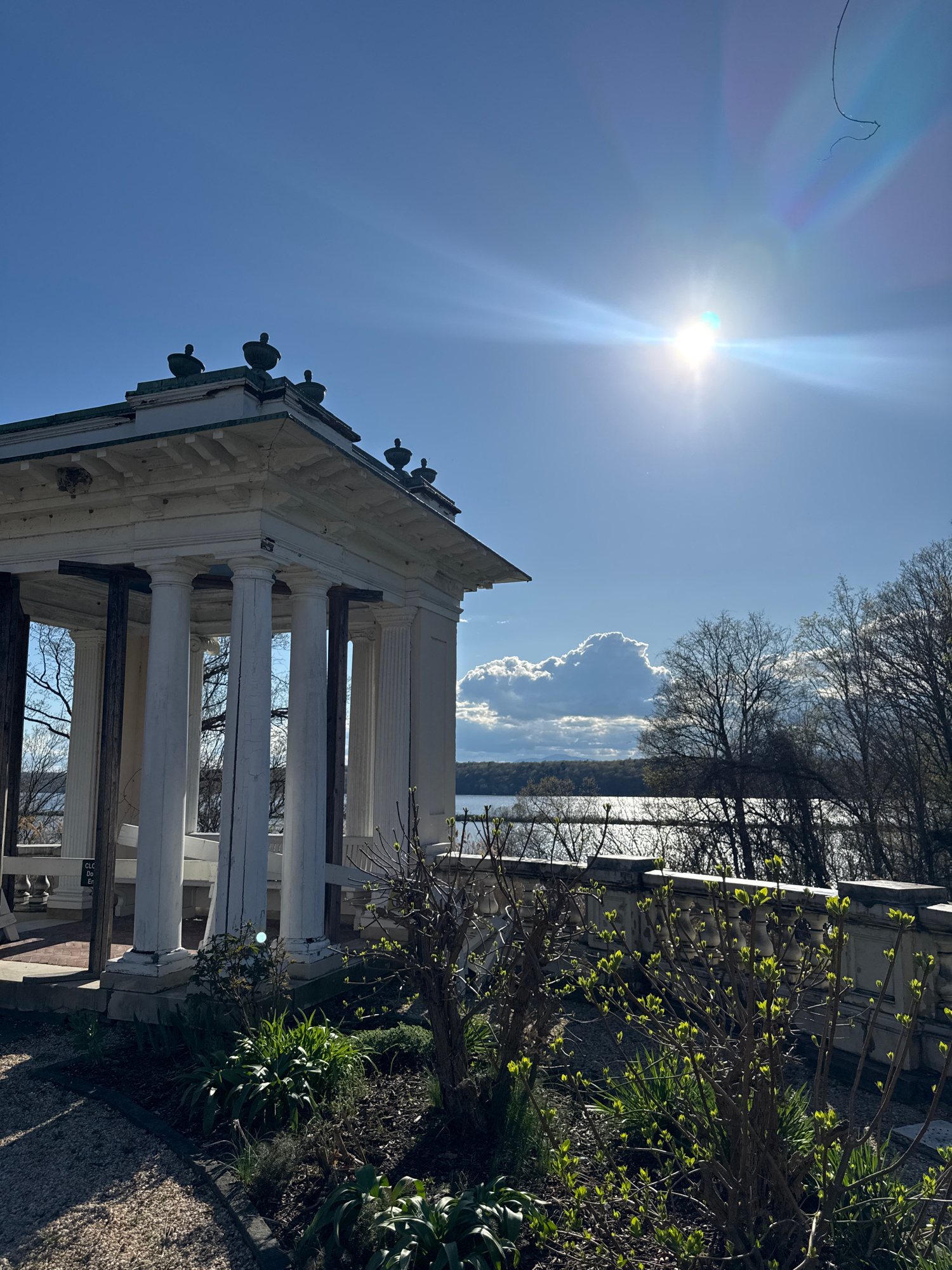 The image shows an outdoor scene featuring a white gazebo-like structure with classical columns, situated near foliage and trees. The sky is clear blue, with the sun shining brightly, creating lens fl…read more
