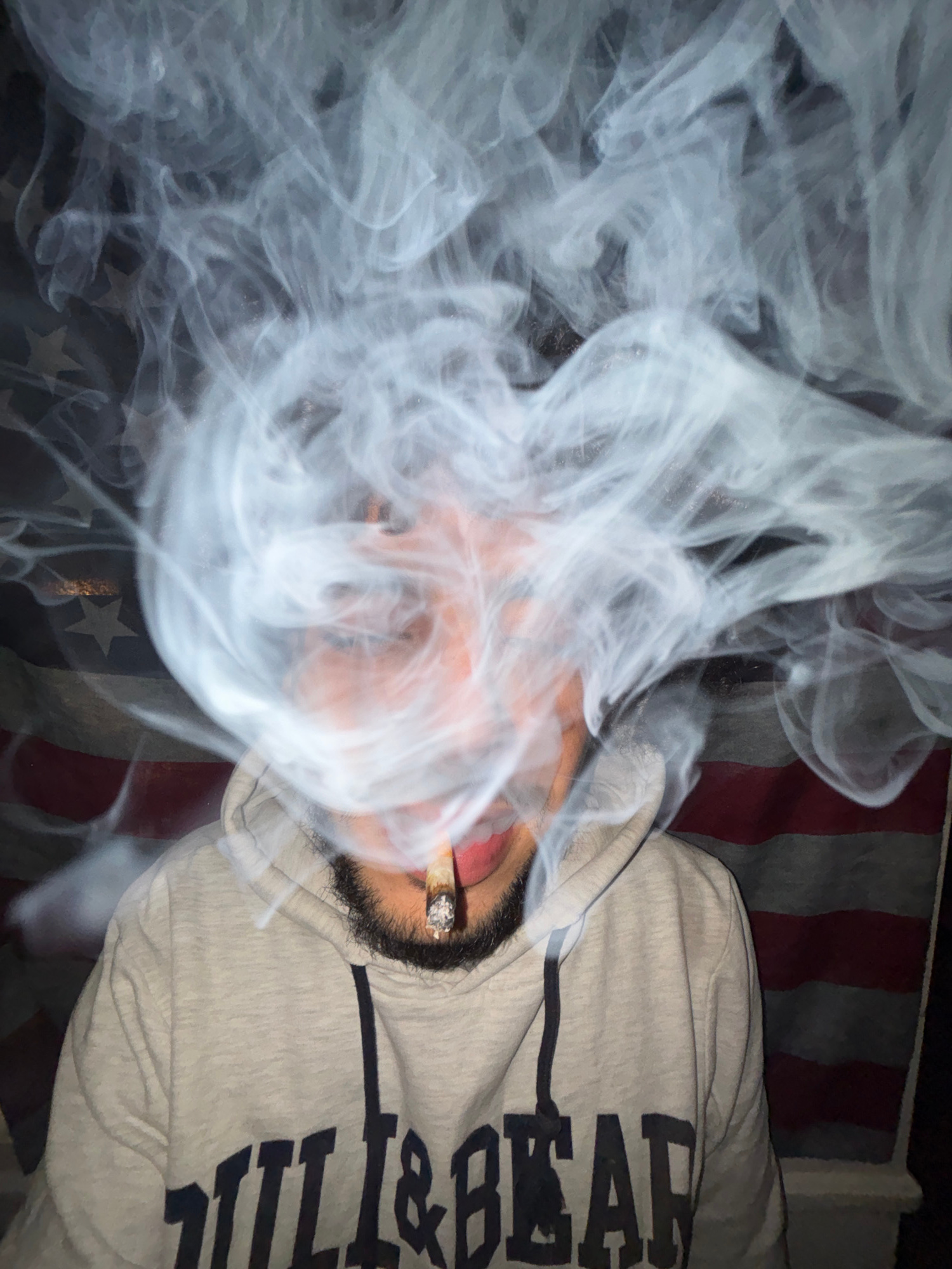 A person is lying on a bed and smoking. The person has a beard and is wearing a light grey hoodie with black letters. A large plume of smoke obscures their face. The bed has a red, white, and grey str…read more