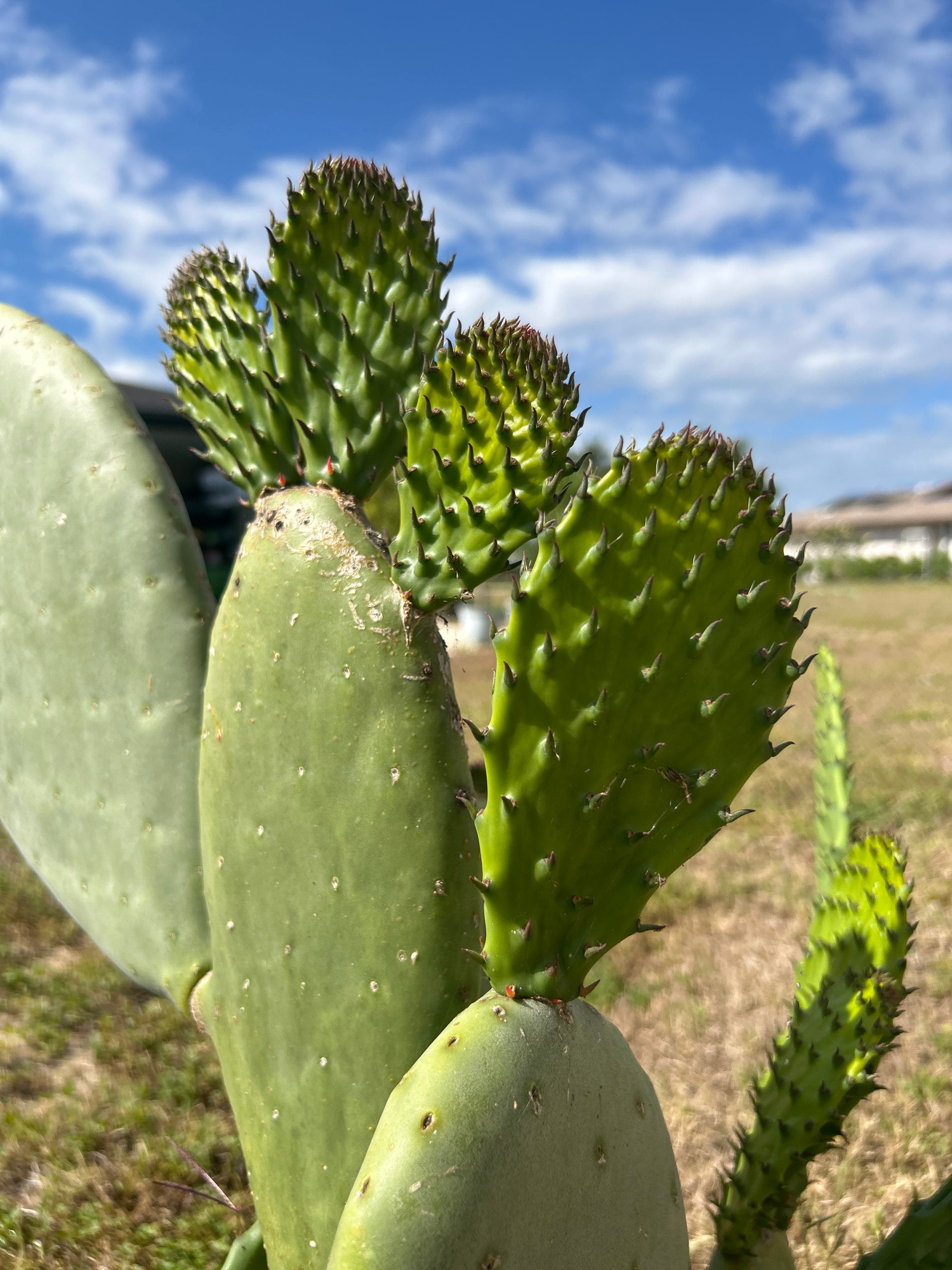 The image shows a close-up of a prickly pear cactus. The cactus pads are green, with visible spines. Some of the pads are younger and smaller, while others are larger and more mature. In the backgroun…read more