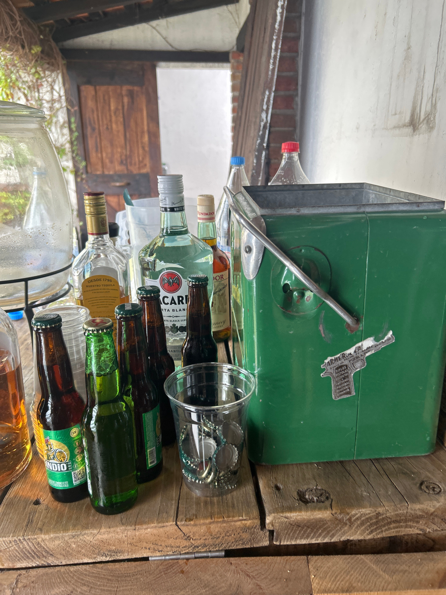 A still life photograph captures a cluttered bar scene, composed of various alcoholic beverages and containers. Stacked on a weathered wooden surface are bottles of tequila, rum (Bacardi Carta Blanca)…read more