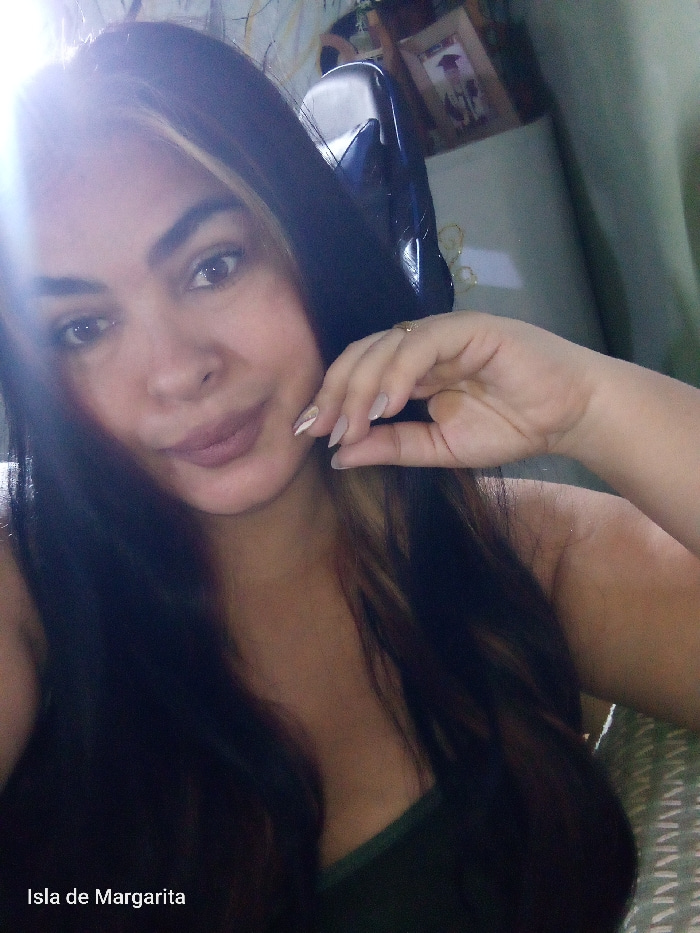A woman is featured in a close-up selfie, looking directly at the camera with a gentle expression. She has long, dark hair with prominent blonde or light brown highlights framing her face. Her makeup…read more