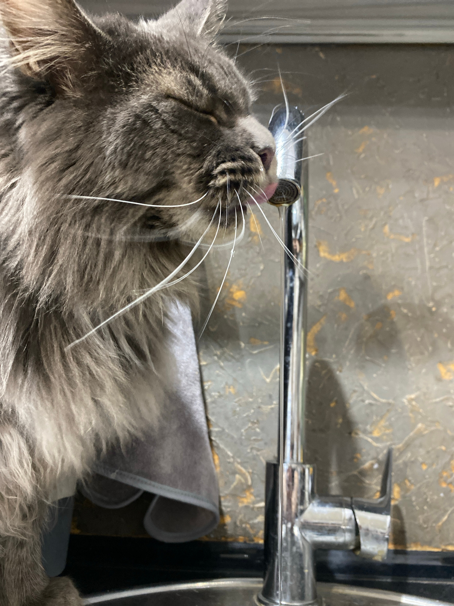 A gray, long-haired cat is drinking water from a silver faucet. The cat's head is tilted upwards and its tongue is extended, touching the faucet. The background is a textured gray and gold wall. A gra…read more