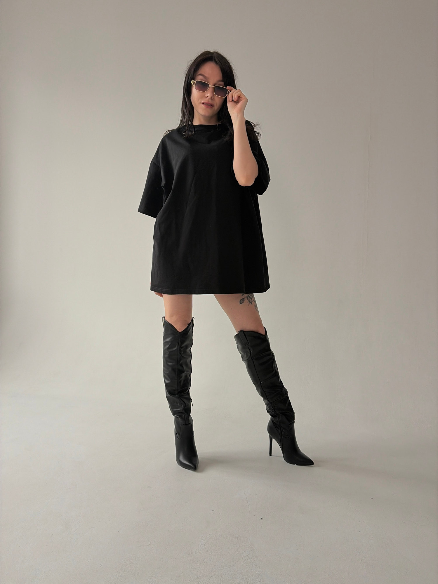 A woman stands in an indoor setting with a light grey background. She is wearing a black, loose-fitting mini dress, black over-the-knee boots, and tinted sunglasses. Her dark hair is loose around her…read more