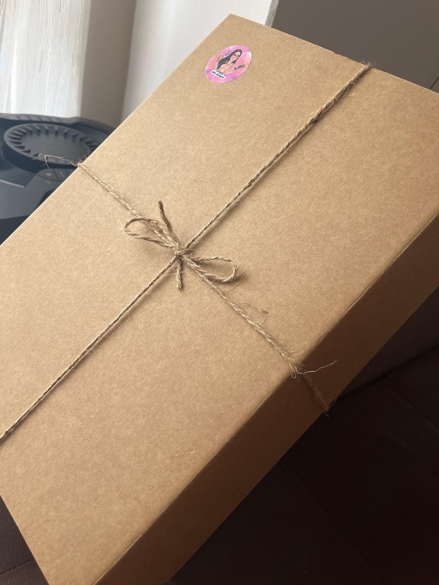 The image shows a rectangular cardboard box, secured with twine tied in a bow at the center. A round sticker with a graphic image is affixed to the upper left corner of the box. The box is placed on a…read more