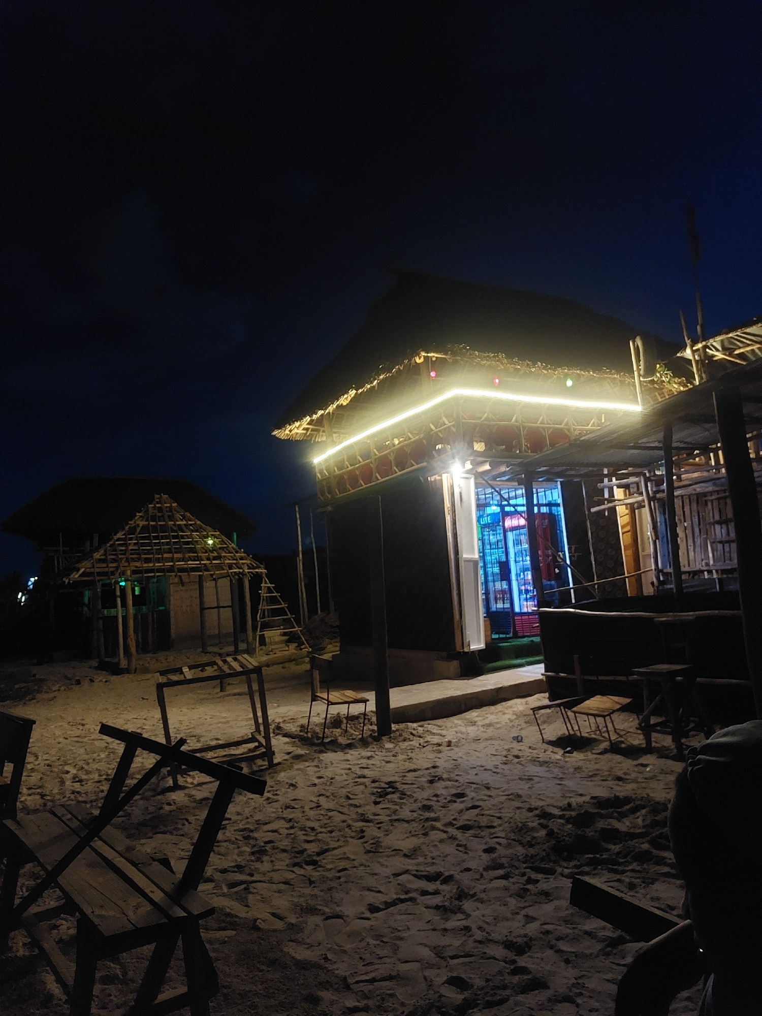 The image shows a night scene in Dar es-Salaam, Tanzania. Two thatched-roof structures are visible, illuminated by string lights along their edges. The foreground shows sandy ground with wooden furnit…read more