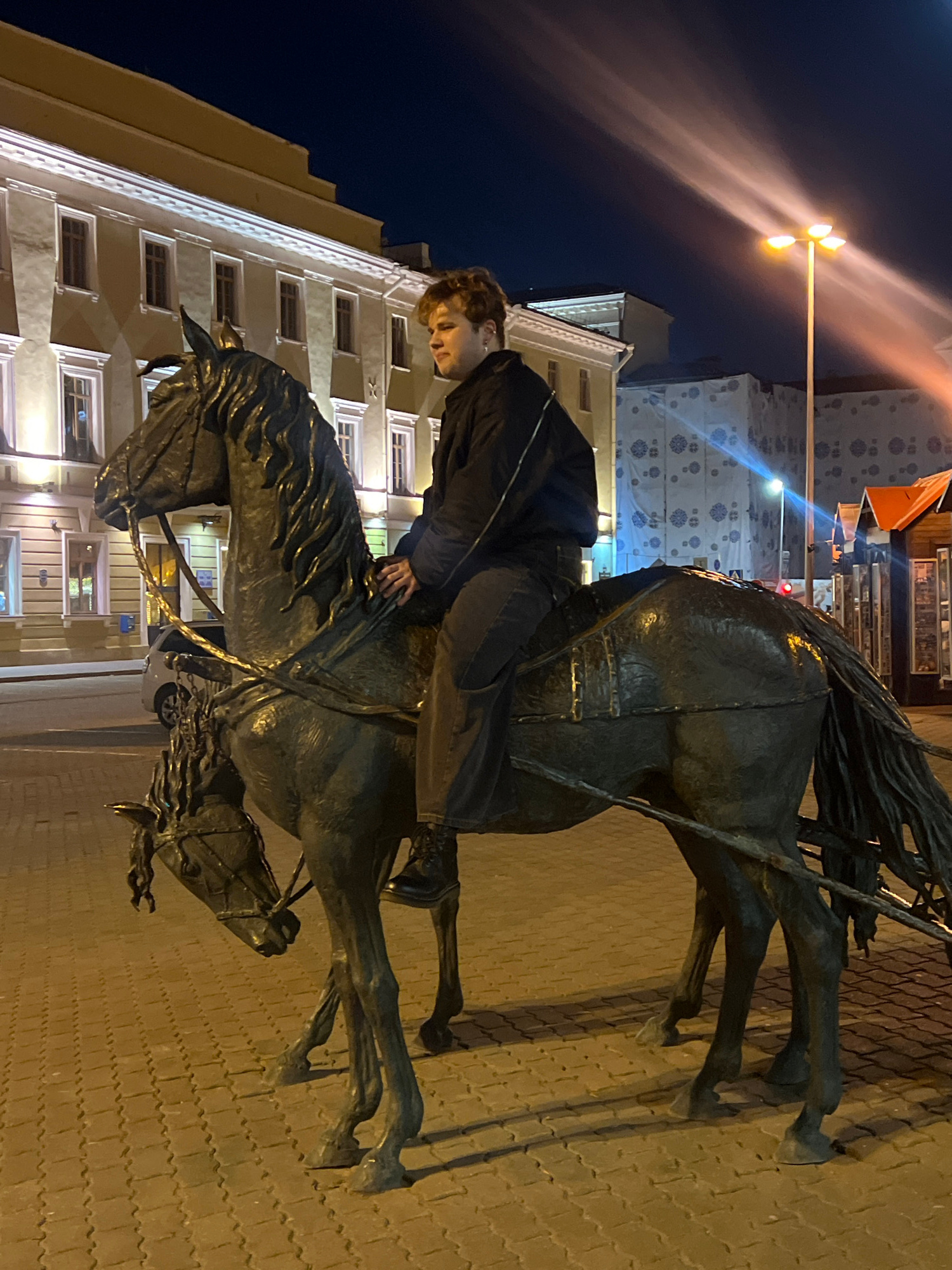 A young man is sitting on a metal sculpture of horses pulling a chariot on a bricked sidewalk in Minsk, Belarus. The sculpture is located in front of a building with multiple windows. A streetlight is…read more