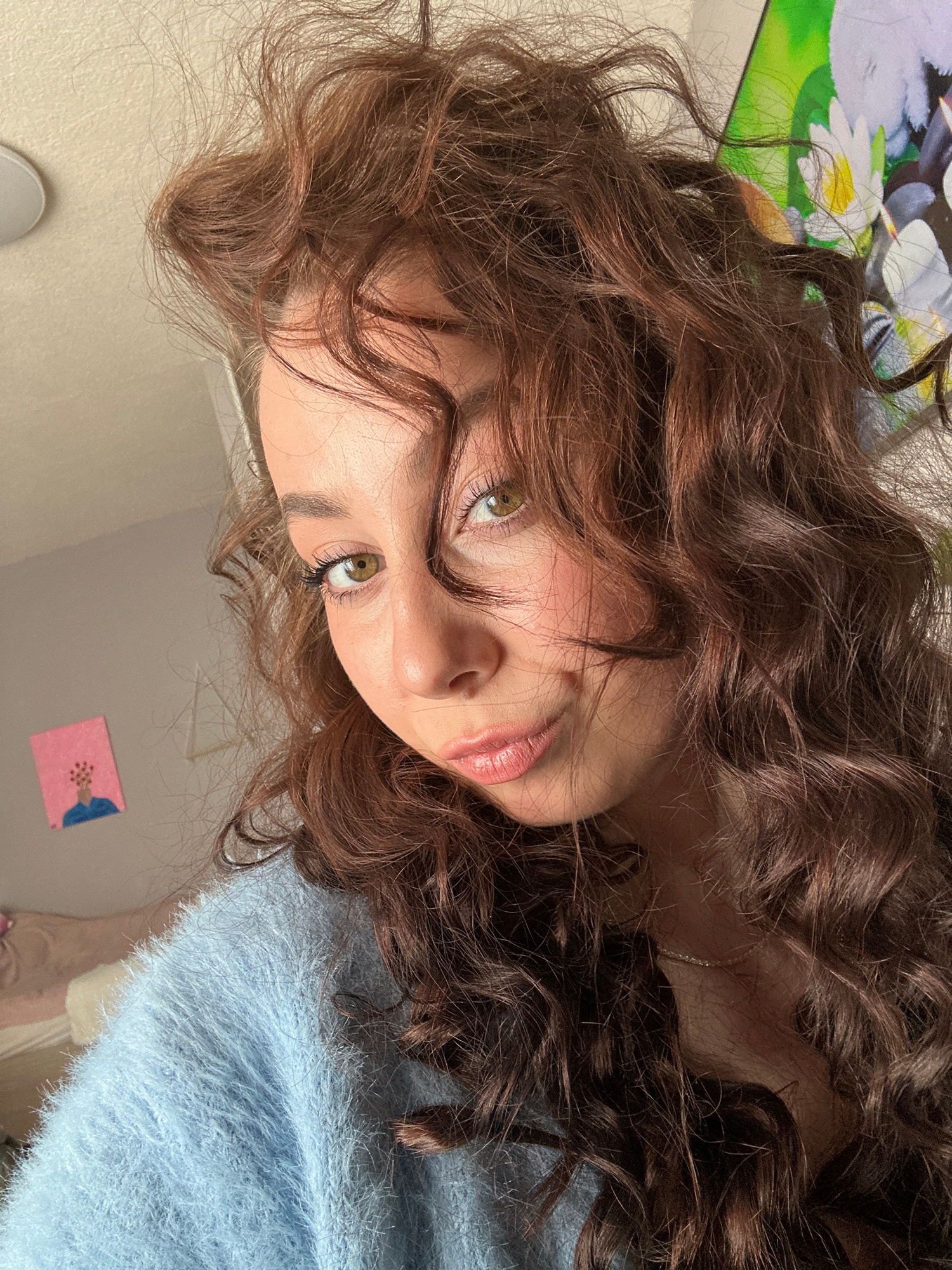 A close-up, tilted, indoor photograph depicts a young woman with light skin, hazel eyes, and shoulder-length, wavy, reddish-brown hair. Her hair is partially obscuring her face. She is wearing a light…read more