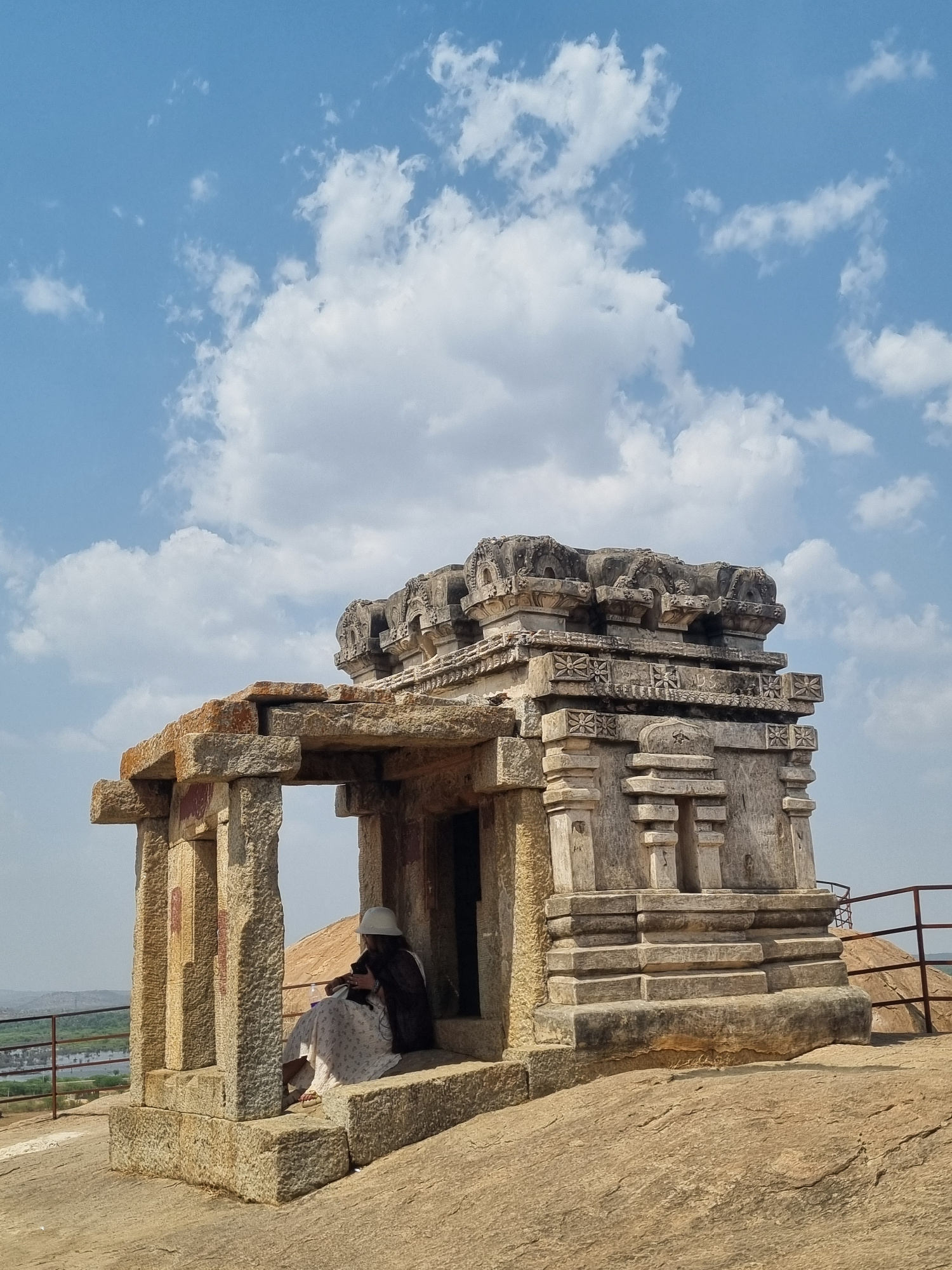 The image shows a stone structure, likely part of a historic building, in Lepakshi, India. The structure is made of rough-hewn stone blocks with intricate carvings near the top. A person is inside the…read more
