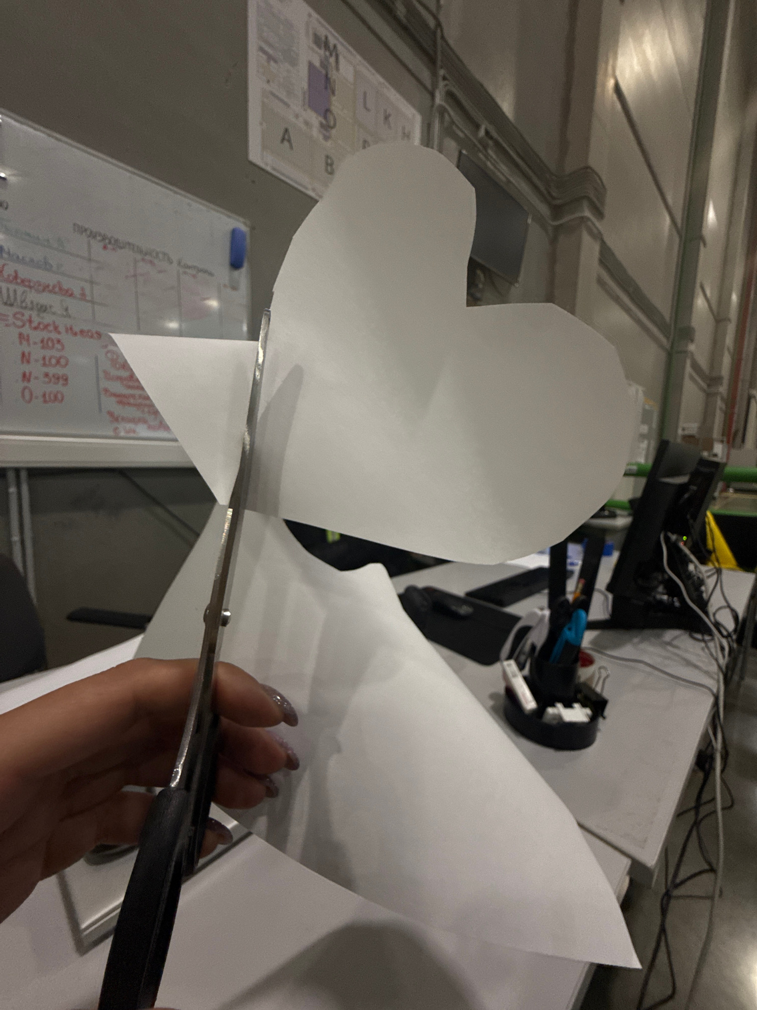 A person is using scissors to cut a white heart shape out of a sheet of white paper. The scene is indoors, likely an office or workshop environment, as indicated by the whiteboards with text in what a…read more