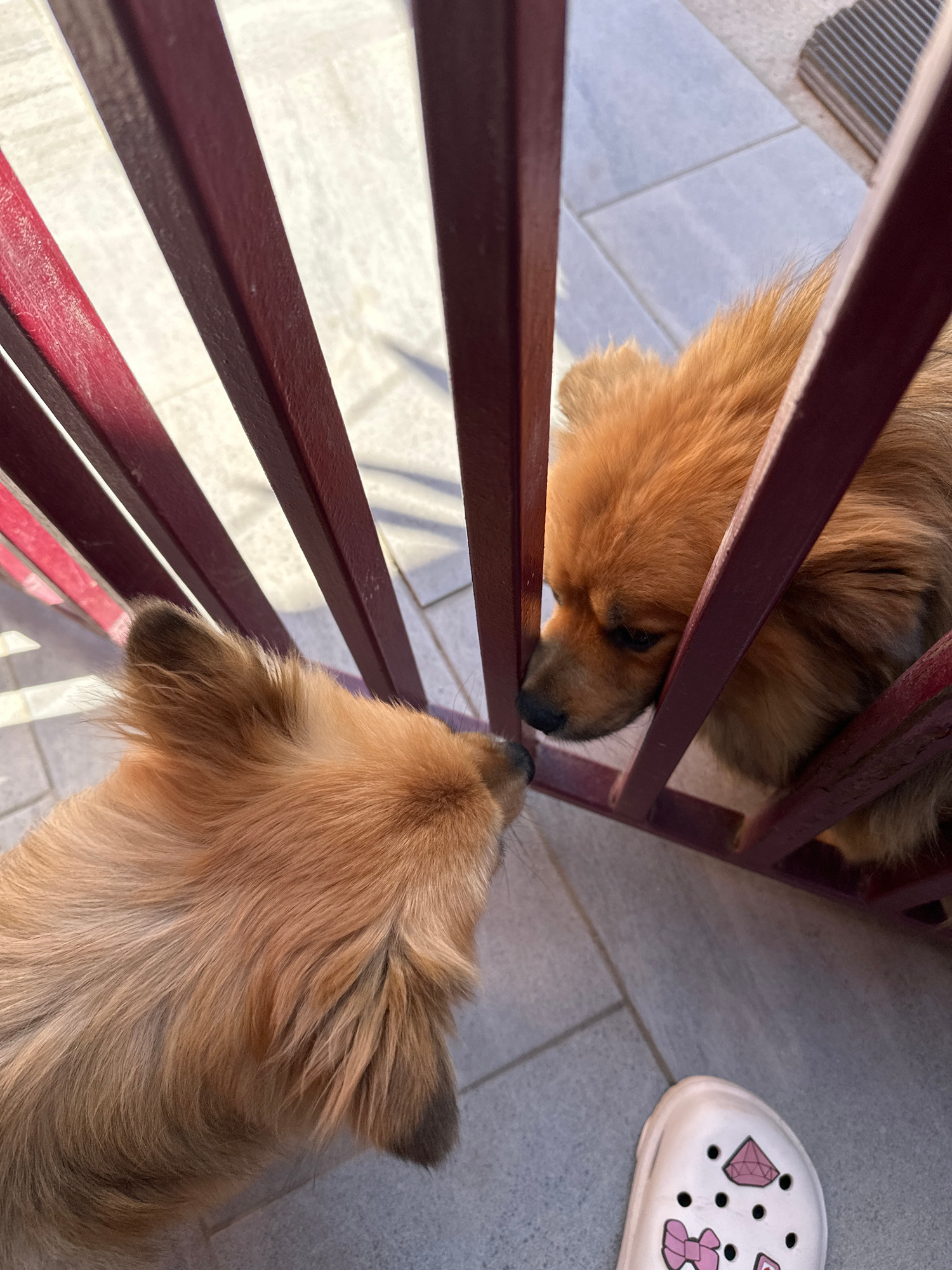 Two light brown Pomeranian dogs are interacting through a burgundy metal railing. One dog is positioned on top, and the other is below, with their noses nearly touching. The scene is outdoors on a til…read more