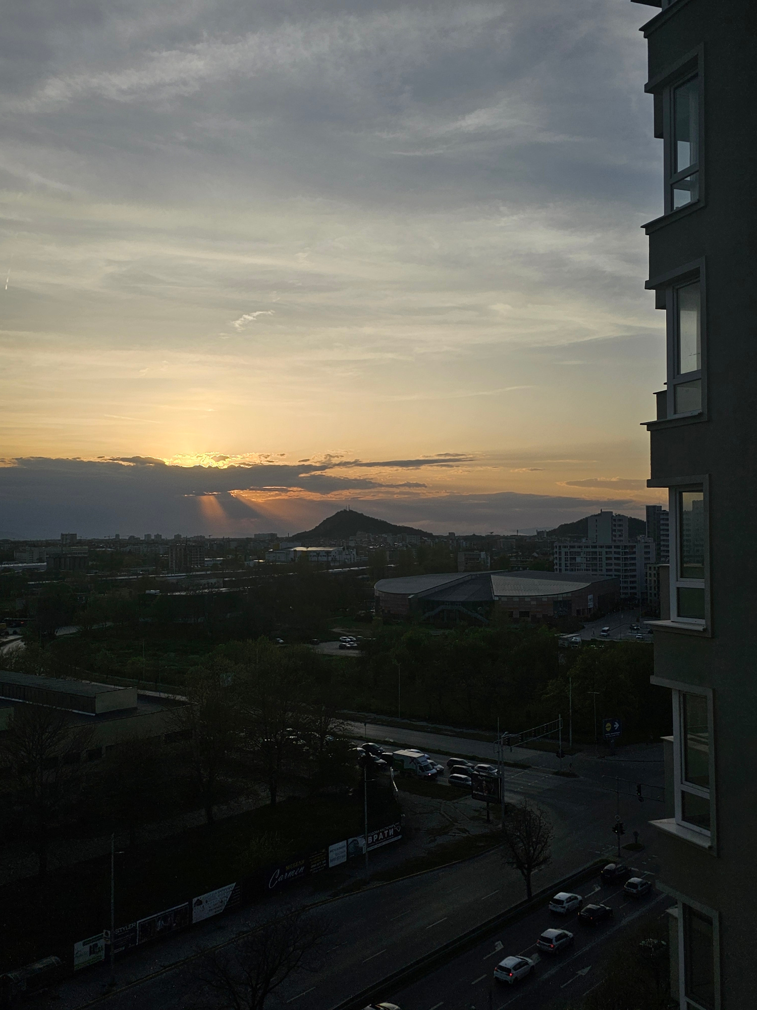 The image shows an elevated view of a city at sunset, possibly taken from a building in Plovdiv, Bulgaria. The left side of the frame is dominated by a cloudy sky with the setting sun casting orange a…read more