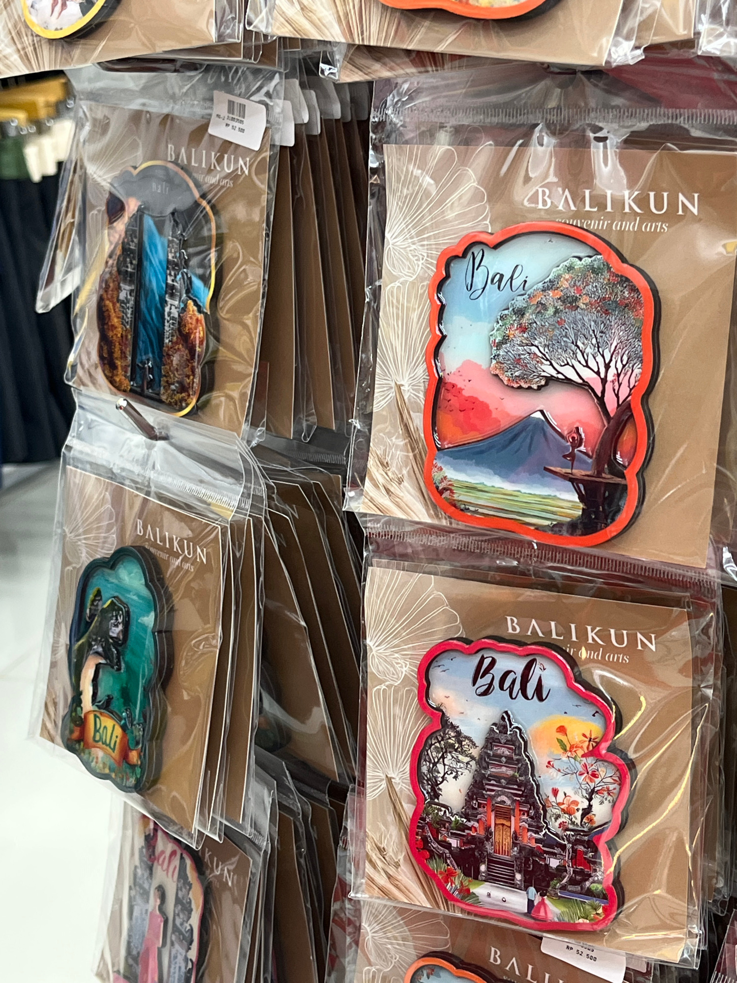 The image shows a collection of packaged souvenirs, likely for sale, with the brand name "BALIKUN" visible on the packaging. Each souvenir is shaped like an irregular cloud or blob and features the wo…read more
