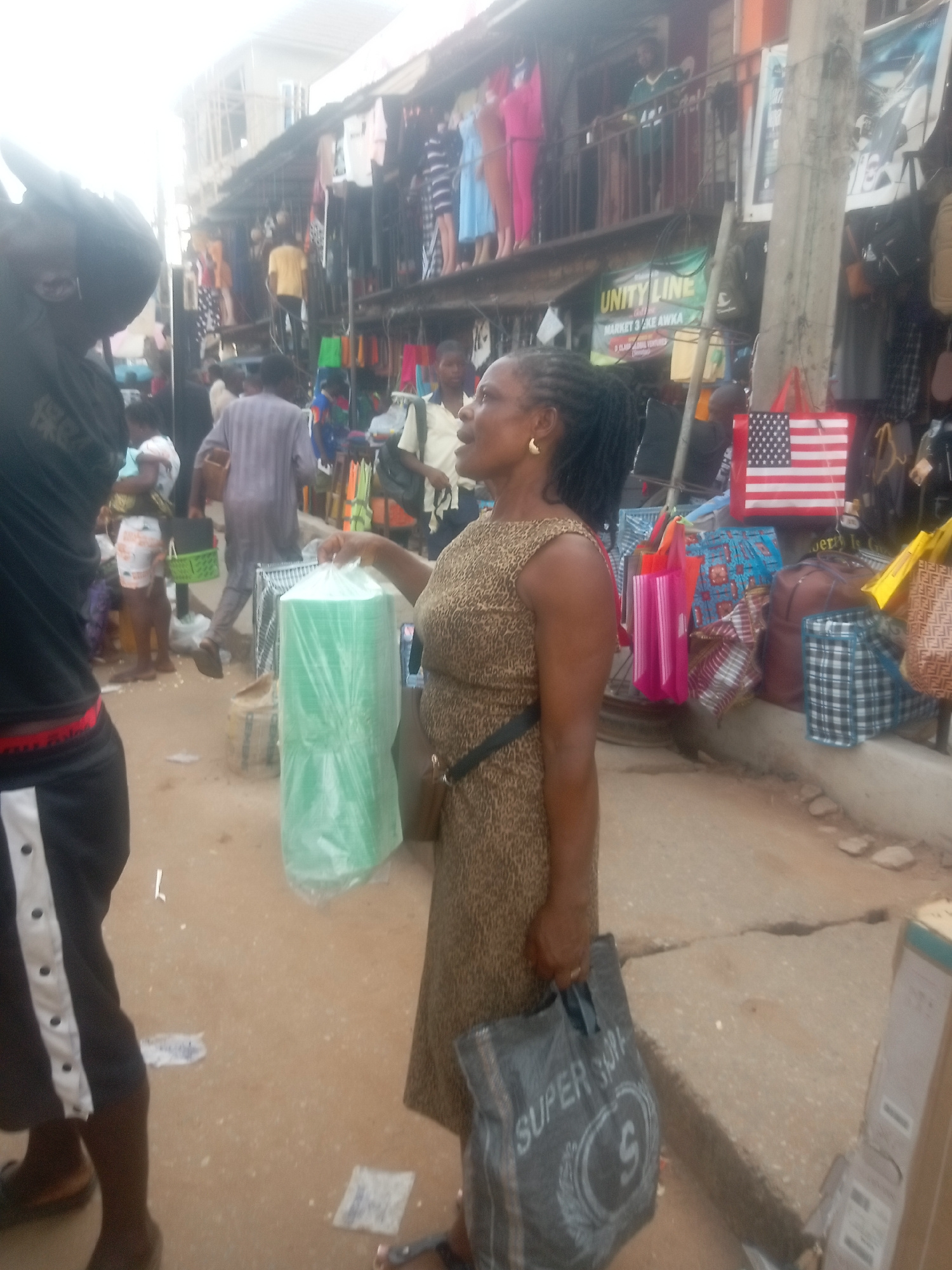 The image depicts a bustling street scene in Awka, Nigeria. An African woman, wearing a brown patterned dress and sandals, is carrying a stack of green plastic cups in a clear plastic bag and a gray s…read more