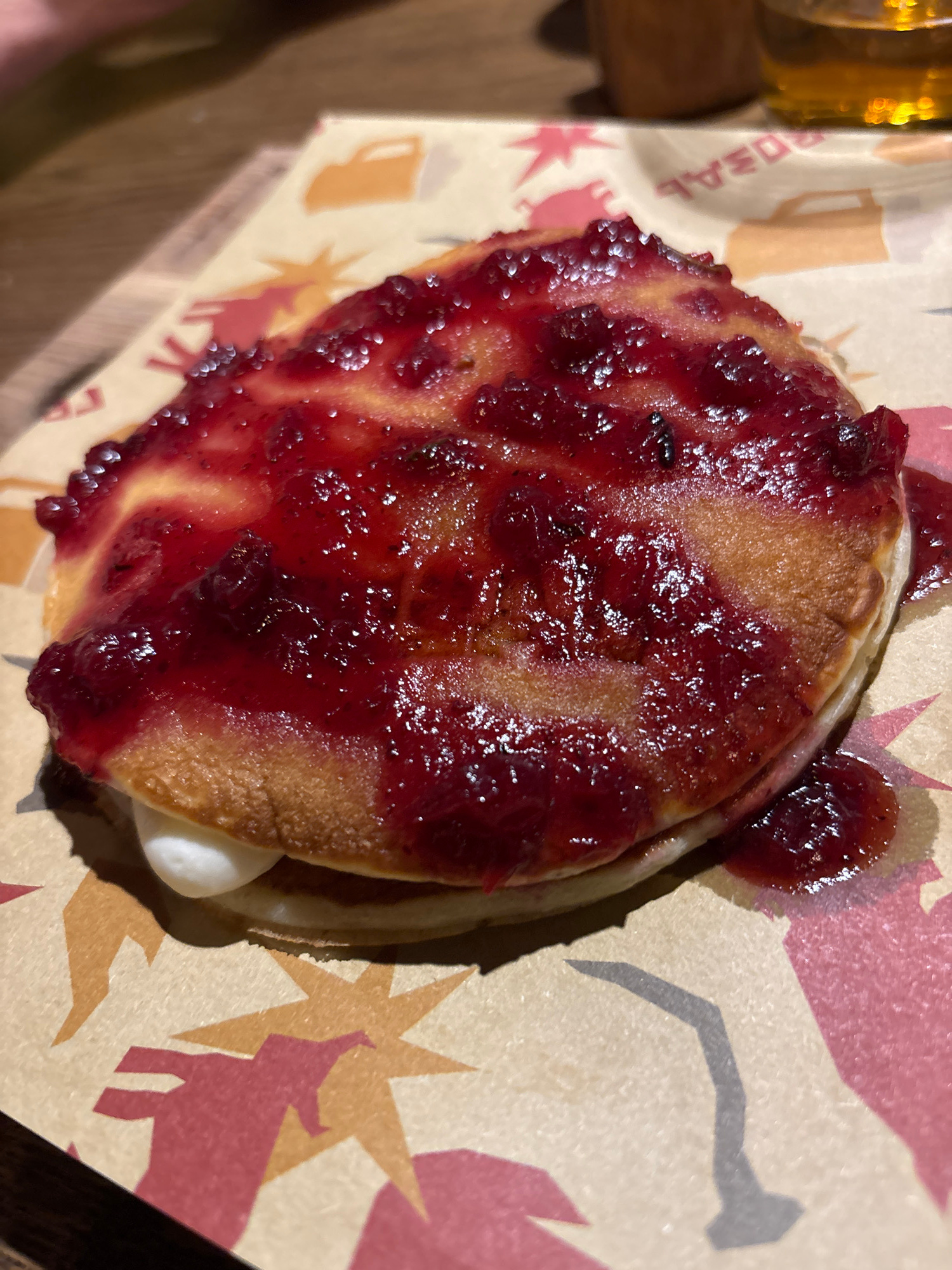 A close-up shot features a pancake topped with a dark red berry jam, appearing to be served on a food wrapper or small tray. The wrapper is decorated with a pattern of beer mugs and stylized animal fi…read more