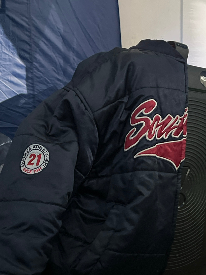 A dark blue quilted puffer jacket is depicted in an unknown, indoor or sheltered location within the city of Unknown, Unknown. The jacket is the primary subject, featuring a circular embroidered patch…read more