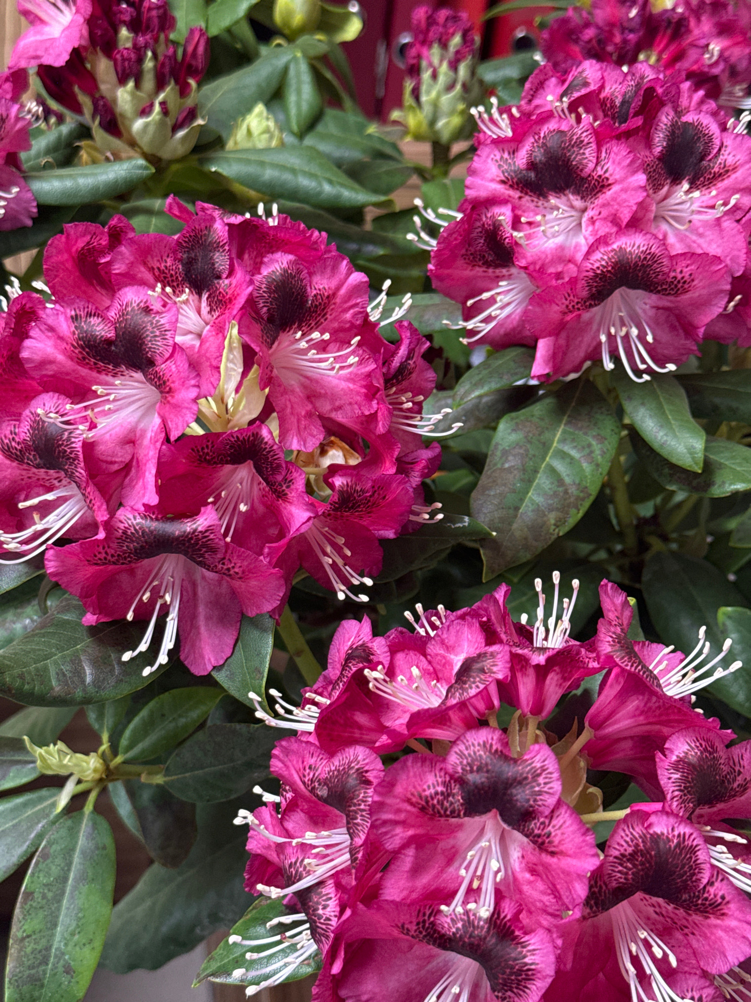 The image shows a close-up of rhododendron flowers in full bloom. The flowers are a vibrant pink color with dark, speckled markings towards the center of each petal. Prominent white stamens protrude f…read more